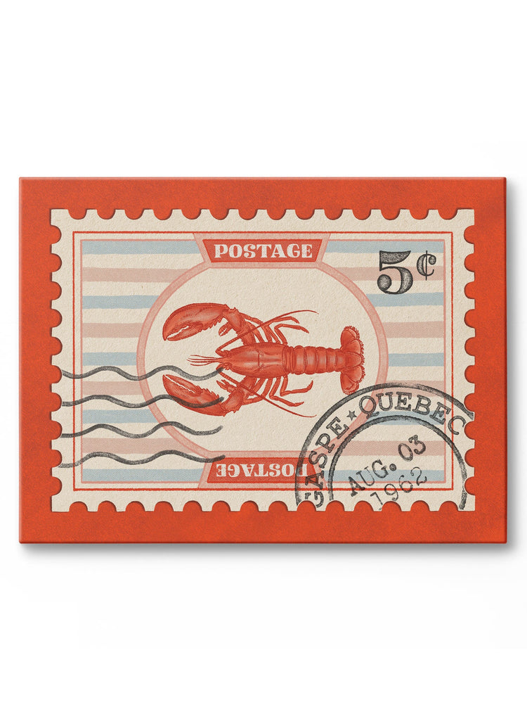 A stamp commemorating Fall 1962 under the Gaspé sun! This red vintage stamp illustrated canvas includes a lobster, a striped pattern, and a nod to the region of Gaspésie in Quebec.