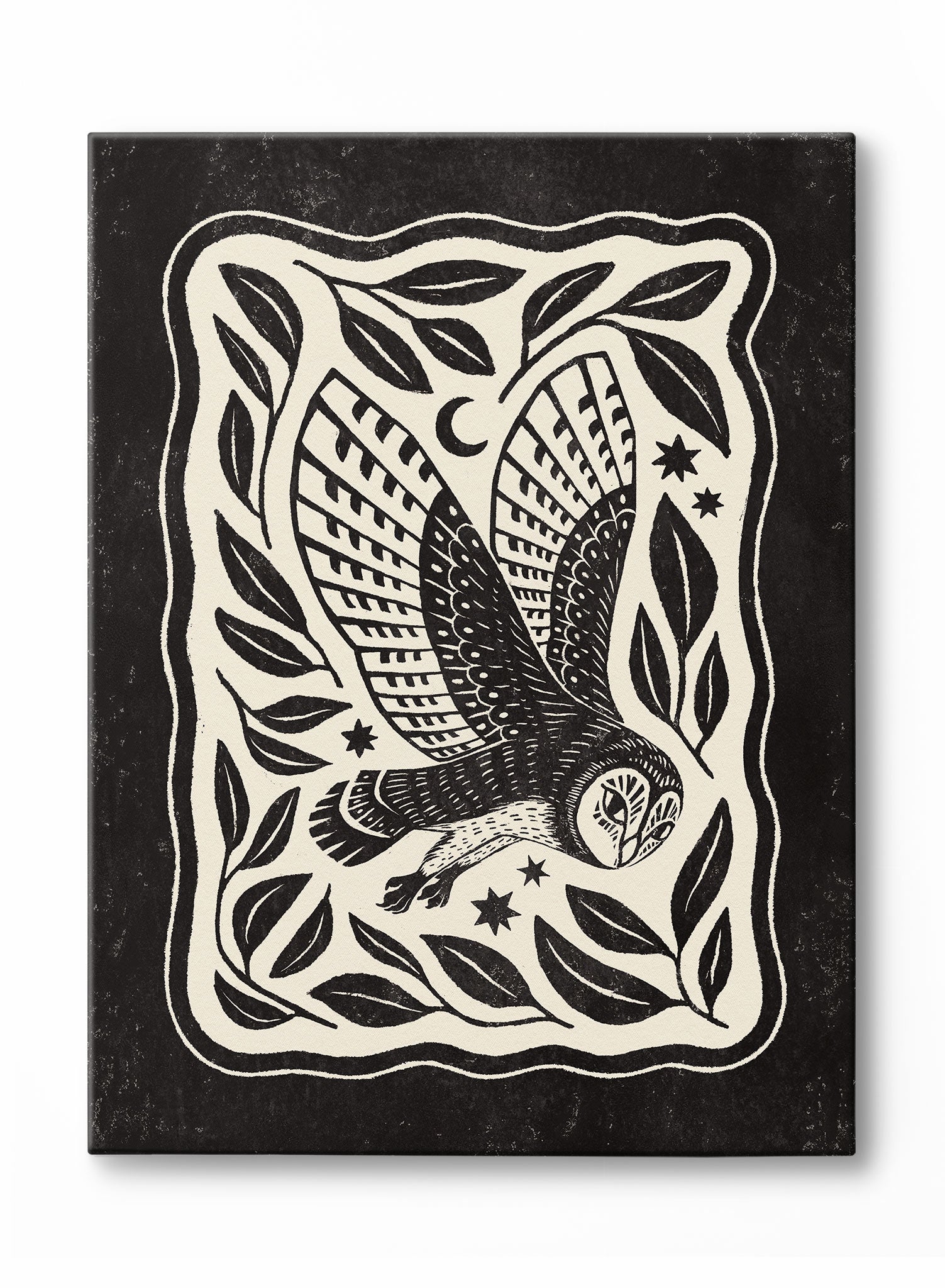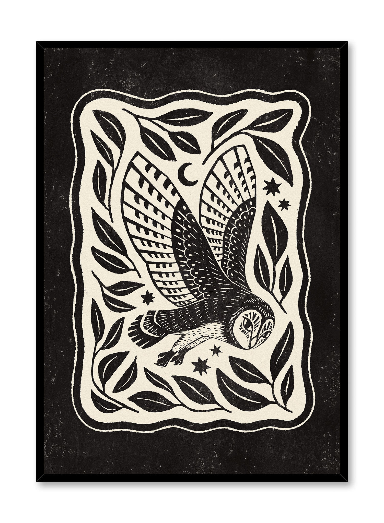This striking print features a bold, monochromatic depiction of an owl in mid-flight, surrounded by a border of stylized leaves and celestial motifs. The owl's wings are intricately detailed, showcasing a dynamic pattern that draws the eye. The background is a deep black, providing a stark contrast to the white elements, enhancing the visual drama of the piece.