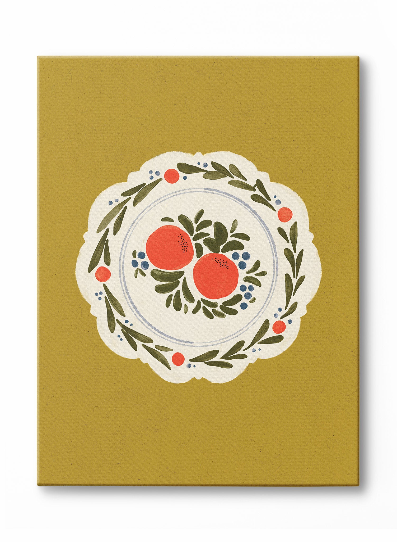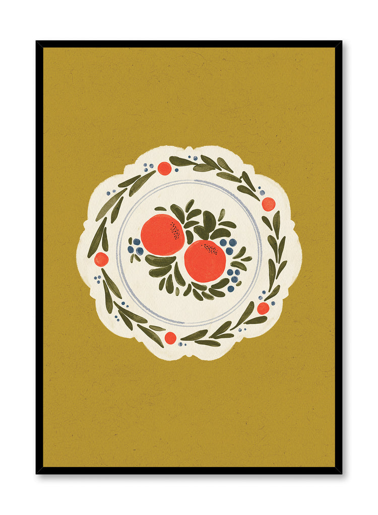 This print features a charming circular motif centered on a warm mustard background. At its heart, two vibrant red fruits are nestled among delicate green leaves and small blue flowers, all encircled by a scalloped white border. The design exudes a sense of simplicity and warmth, reminiscent of traditional folk art patterns.