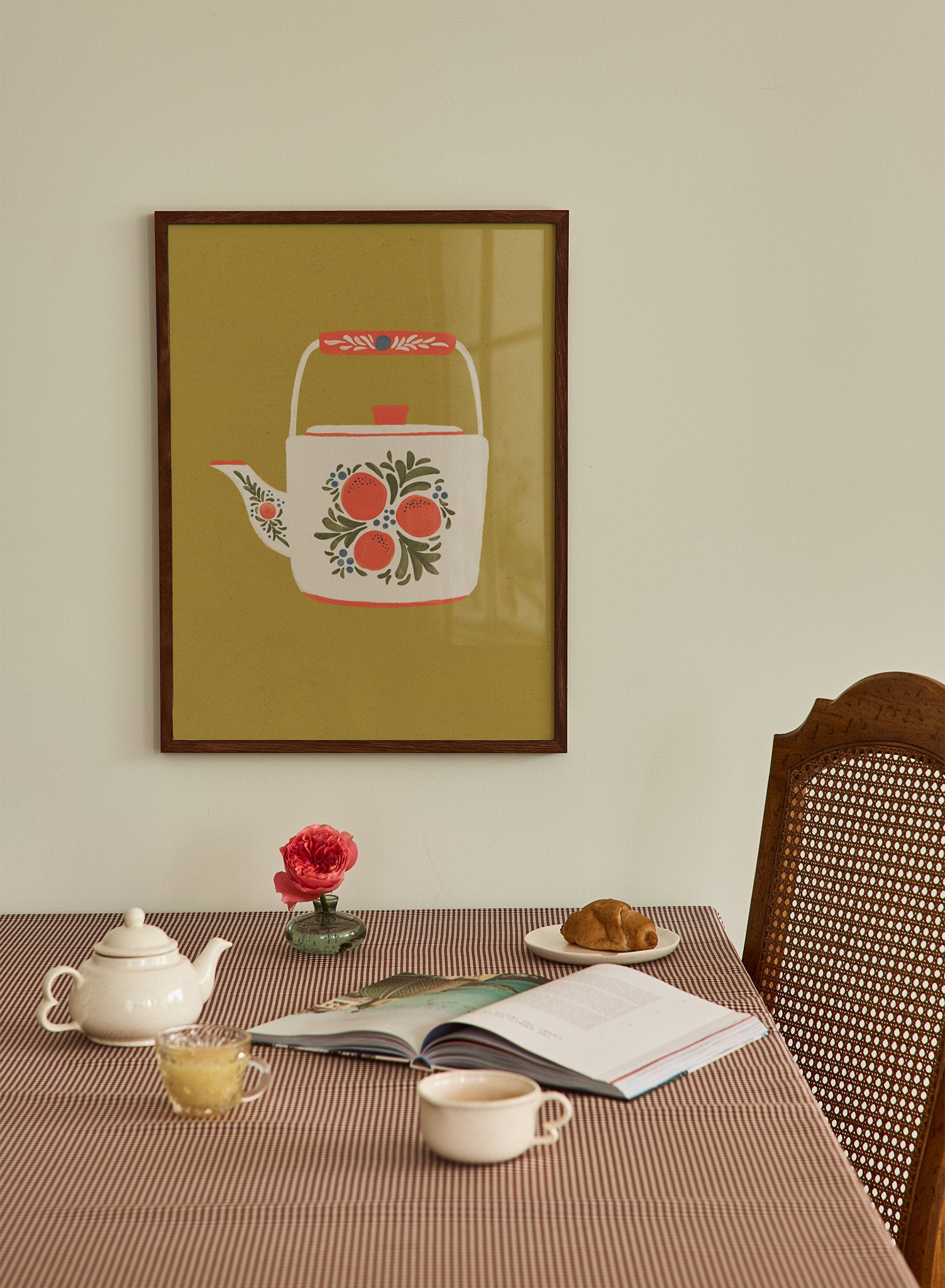 Perfect for a kitchen or dining area, this print can be styled alongside vintage tableware or rustic wooden elements to enhance its cozy appeal. It also complements spaces with a cottagecore or granny-chic theme, adding a touch of nostalgia and warmth. Pair it with other folk-inspired prints or floral arrangements to create a cohesive and inviting atmosphere.
