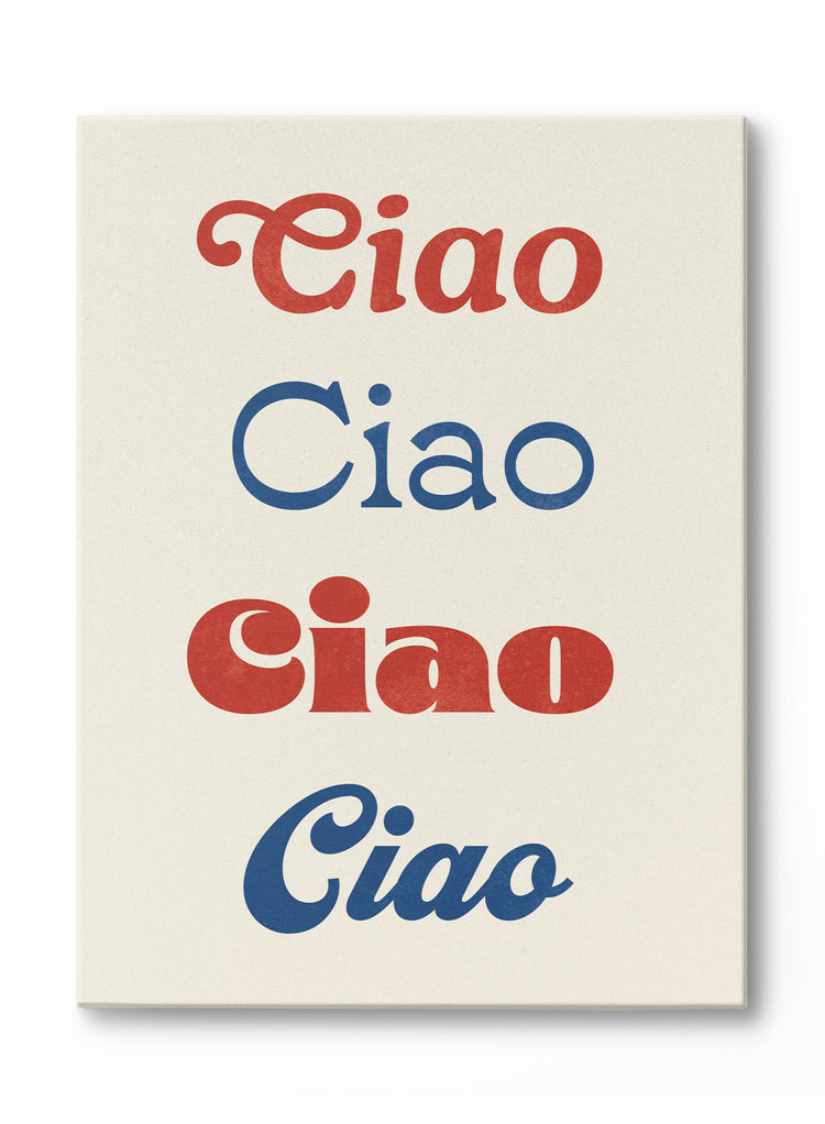 This typographic print offers a warm Italian welcome with the word "Ciao" repeated in alternating styles and colors. The friendly greeting shifts between a sophisticated red serif font and a modern blue sans-serif, creating a playful and rhythmic visual pattern. It's a simple, stylish piece that captures the chic and effortless spirit of Italy.