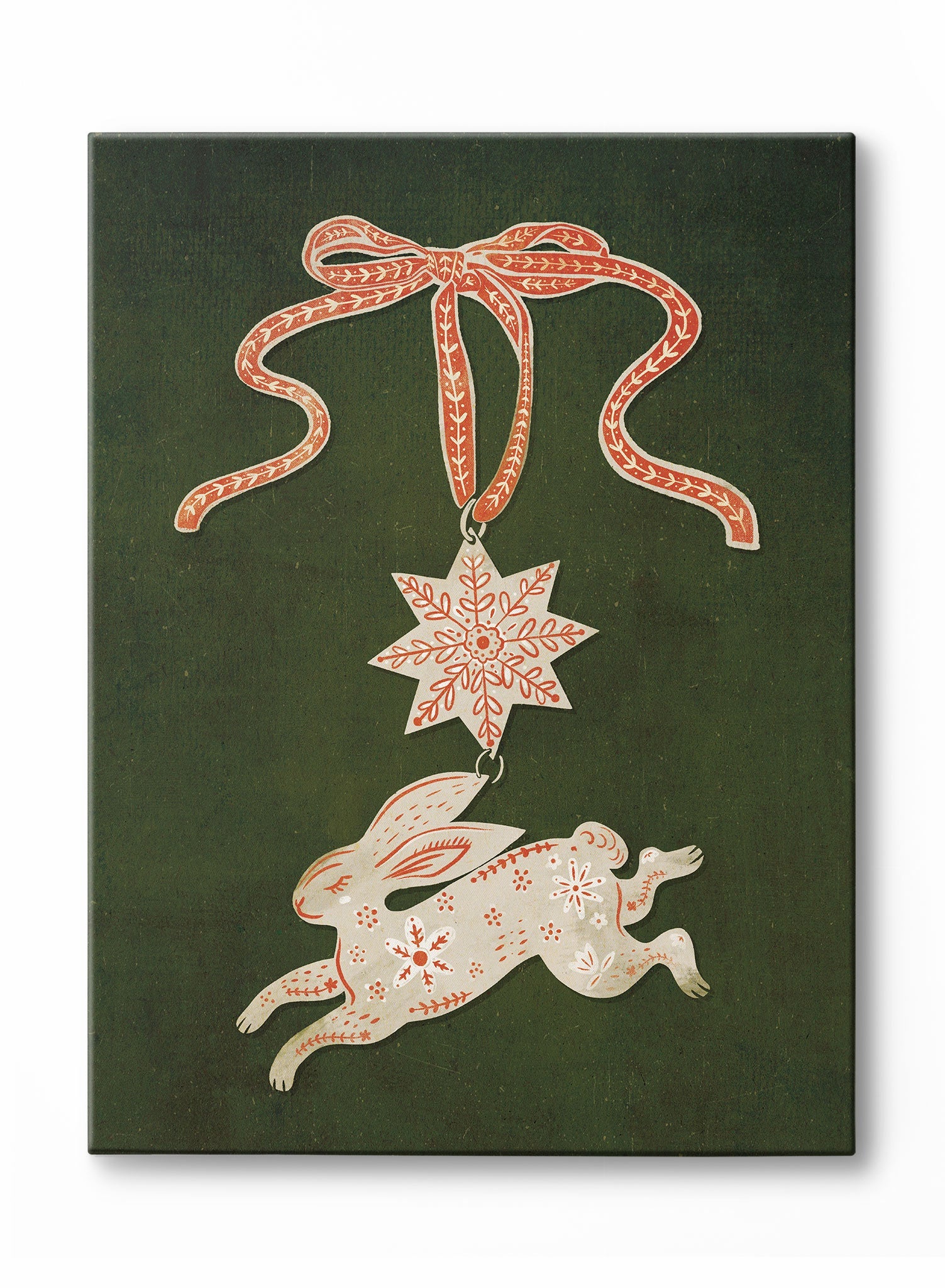 This canvas captures a charming winter scene featuring a leaping rabbit adorned with intricate patterns, suspended from a festive red bow. Above the rabbit, a star-shaped ornament adds a touch of holiday magic, all set against a deep green background that evokes the richness of a forest in winter.
