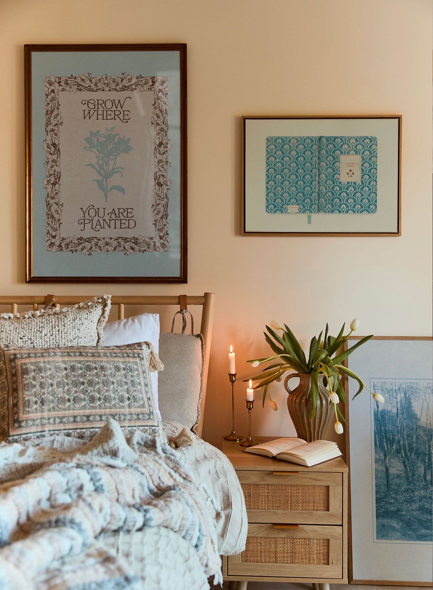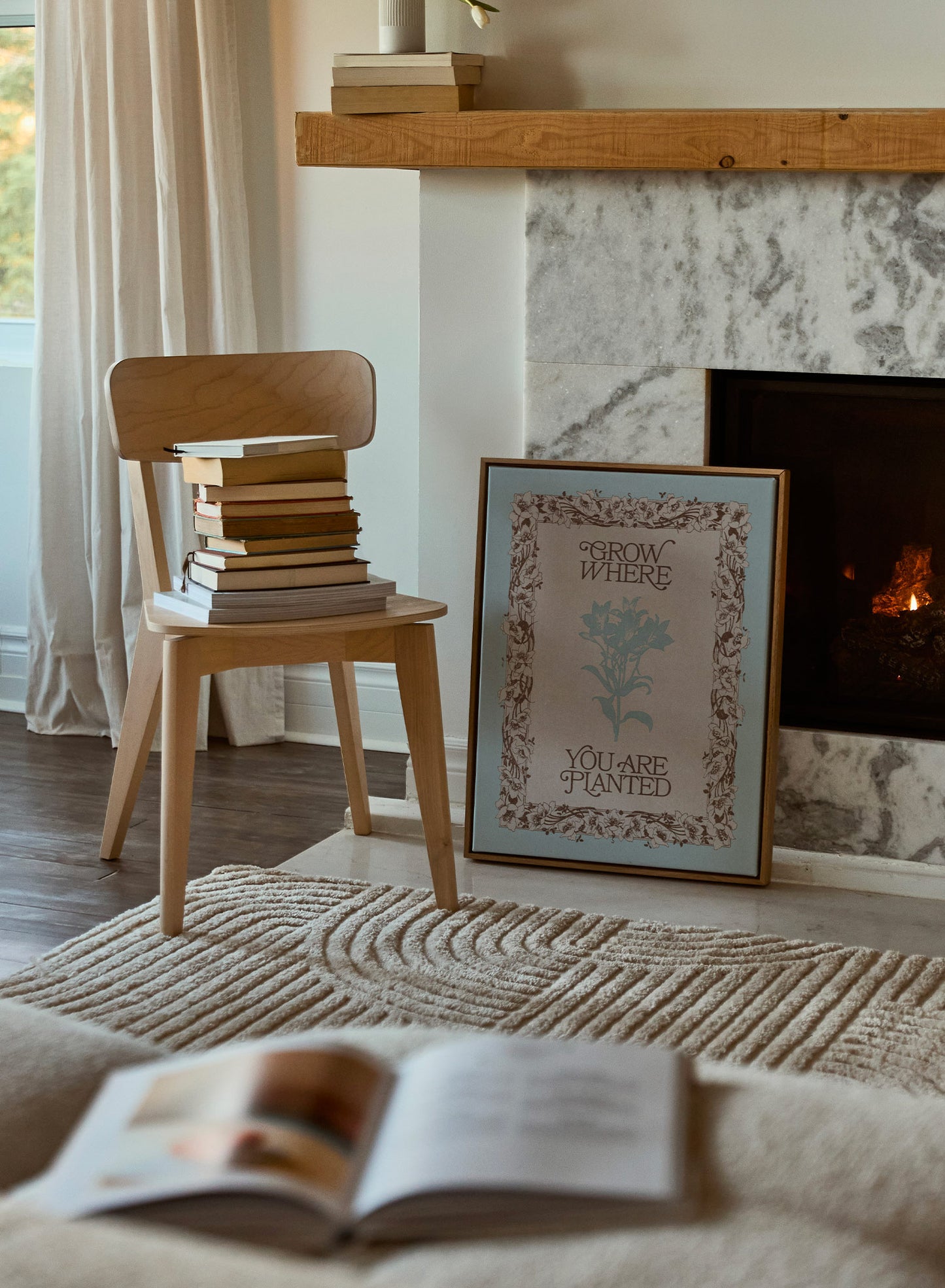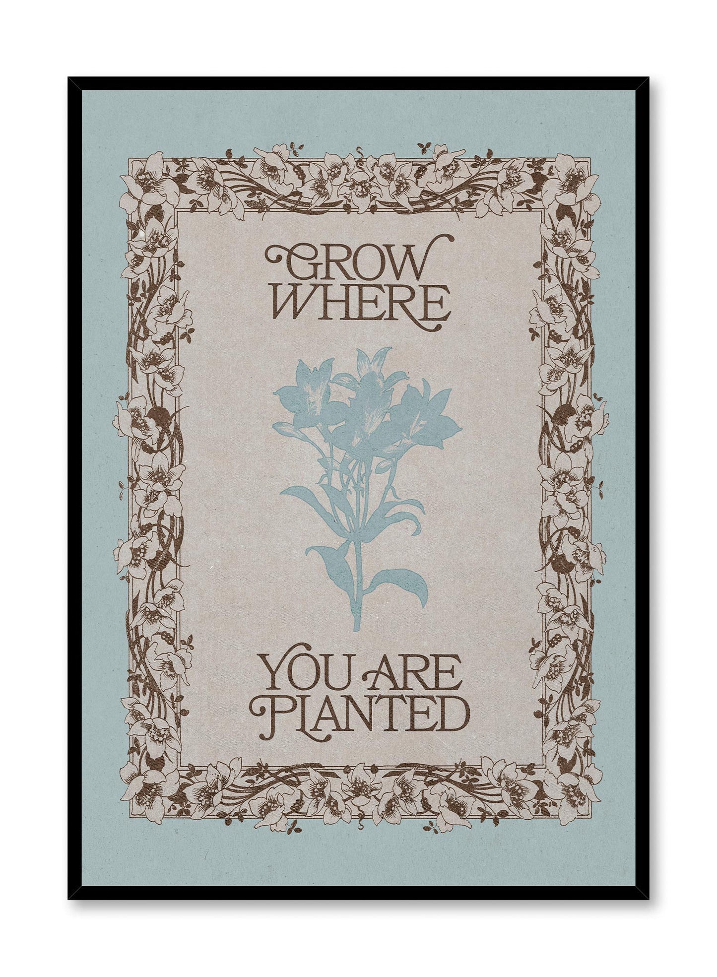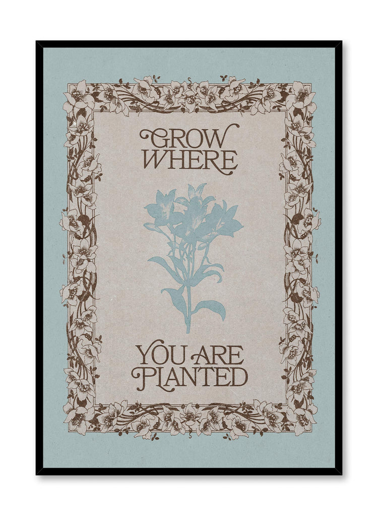 This vintage-inspired print combines intricate floral borders with an uplifting message: “Grow where you are planted.” The muted blue and brown tones lend a timeless appeal, while the floral detailing adds a romantic, nostalgic touch.