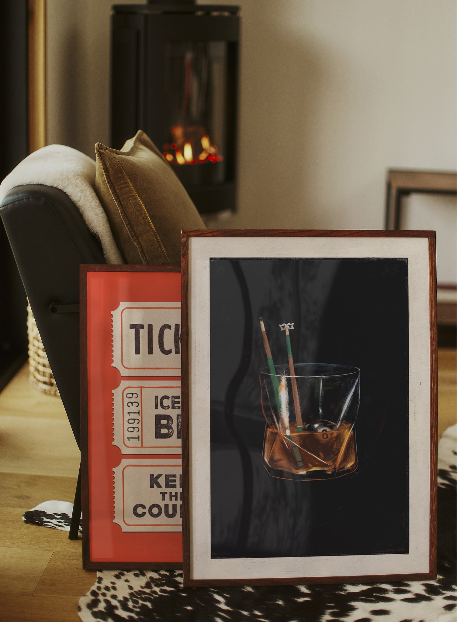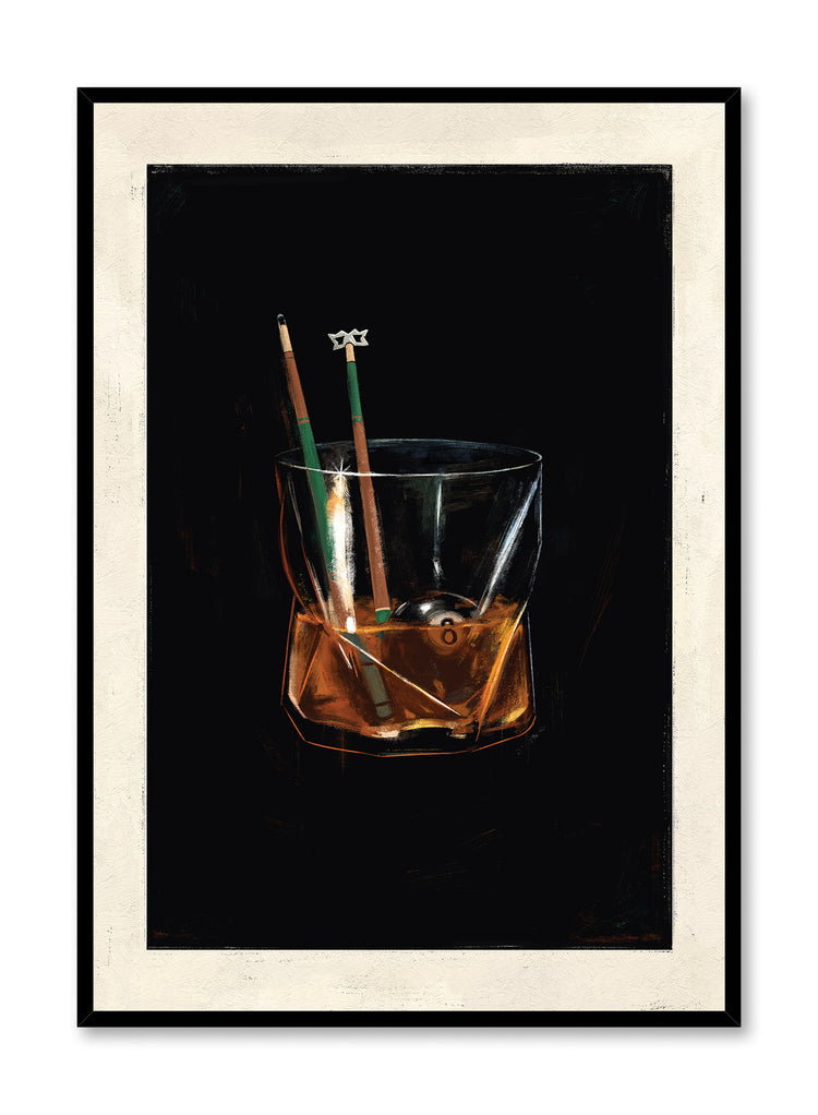 An eight-ball and pool cues rest effortlessly within an angular crystal whiskey glass, highlighting an inventive combination of billiards and evening leisure. Amber hues deepen dramatically against the black background, enhancing the print's playful charm.