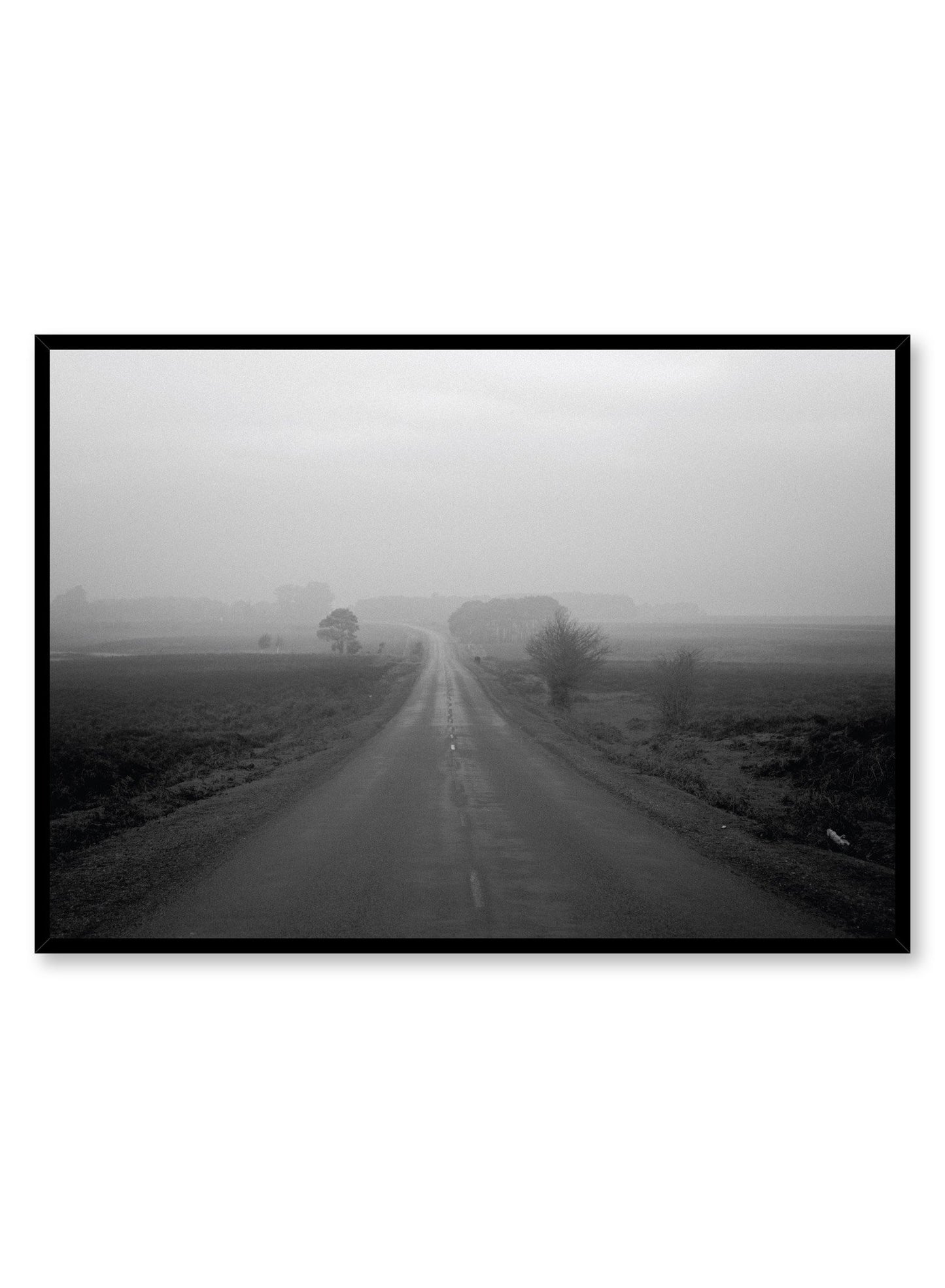 The winding, misty road entices the viewer into the unknown, beckoning them to discover what lies beyond.