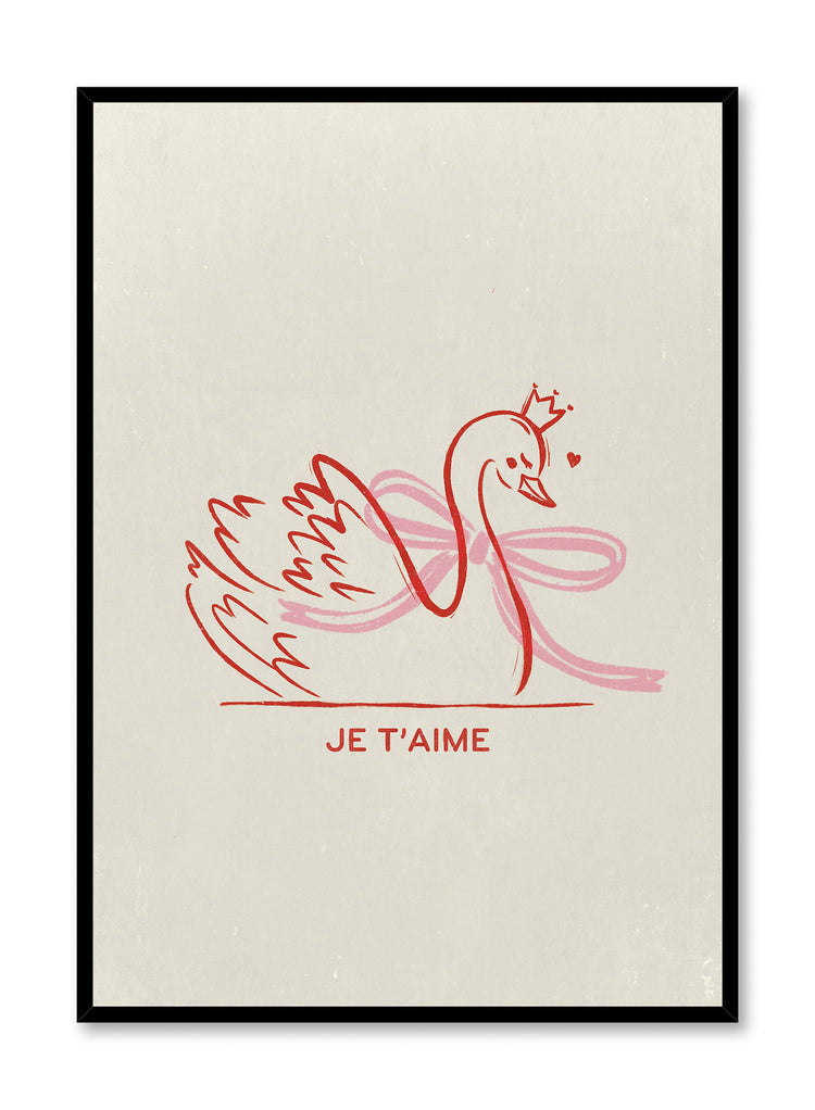 This charming print captures the essence of tender affection with a hand-drawn illustration of a swan, crowned regally and adorned with a soft pink ribbon. Beneath the graceful figure, the French phrase “Je T’aime” adds a poetic touch, evoking feelings of love and whimsy.