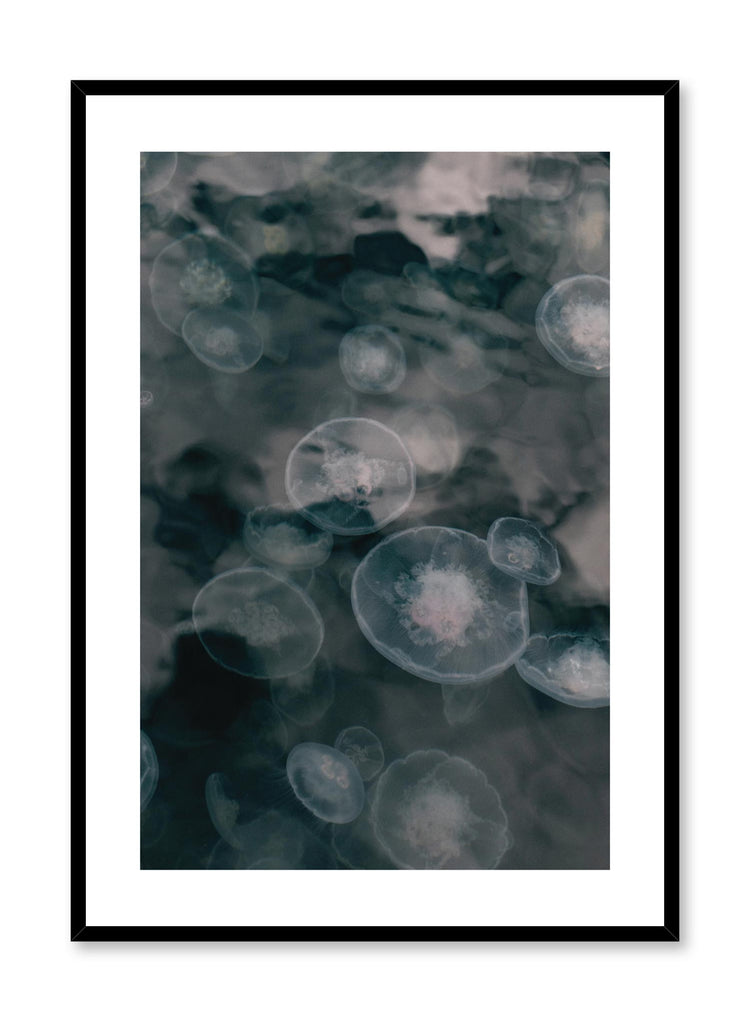 A bloom of clear jelly fish photographed in moody ambiance.