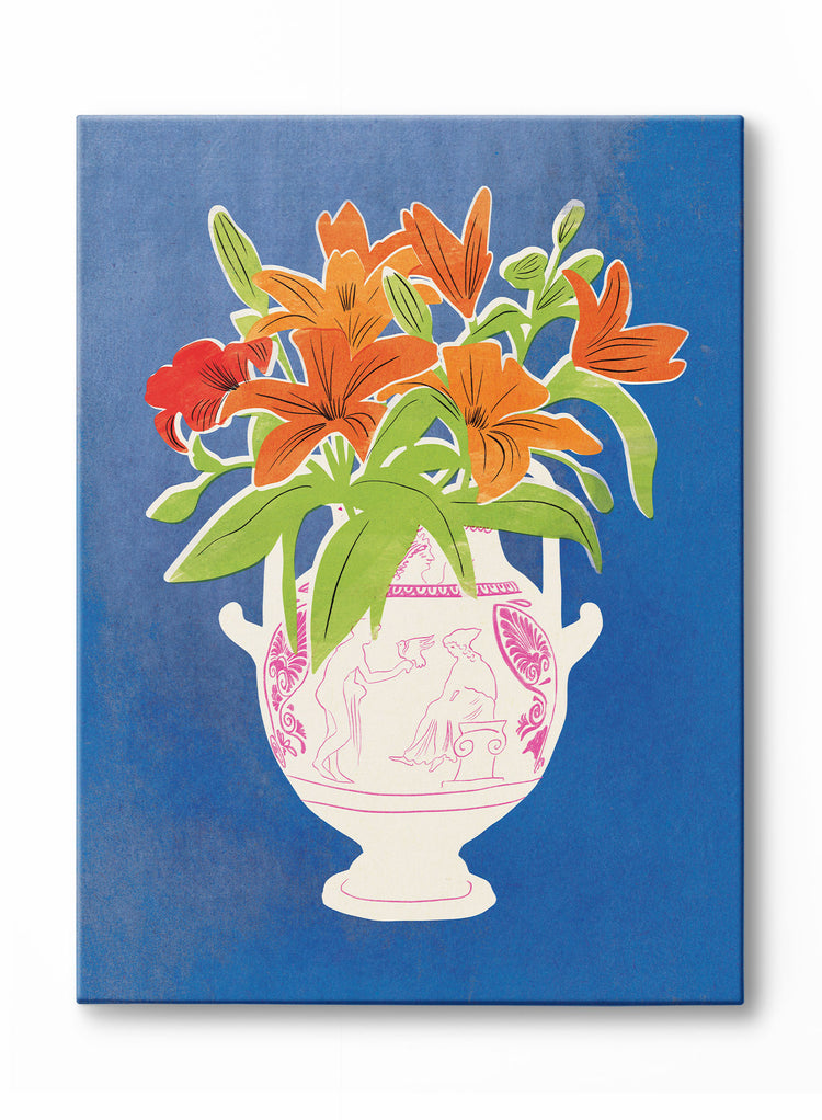 This show-stopping still life canvas features a white vase with pink ornamentation holding a lush bouquet of red Amaryllis flowers and green leaves. A deep blue background completes the look.