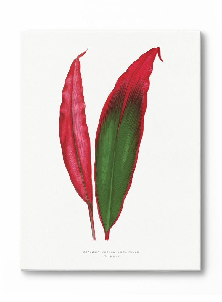 Invite nature in with this gorgeous canvas of green and red Dracaena ferrea leaves over a white background.