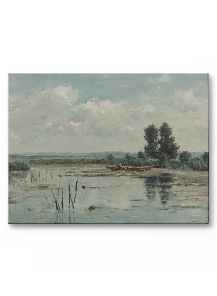 Willem Roelofs’ ‘Lake Near Loosdrecht’ is a calming lake landscape including reflections on calm water and a row boat floating in the distance.