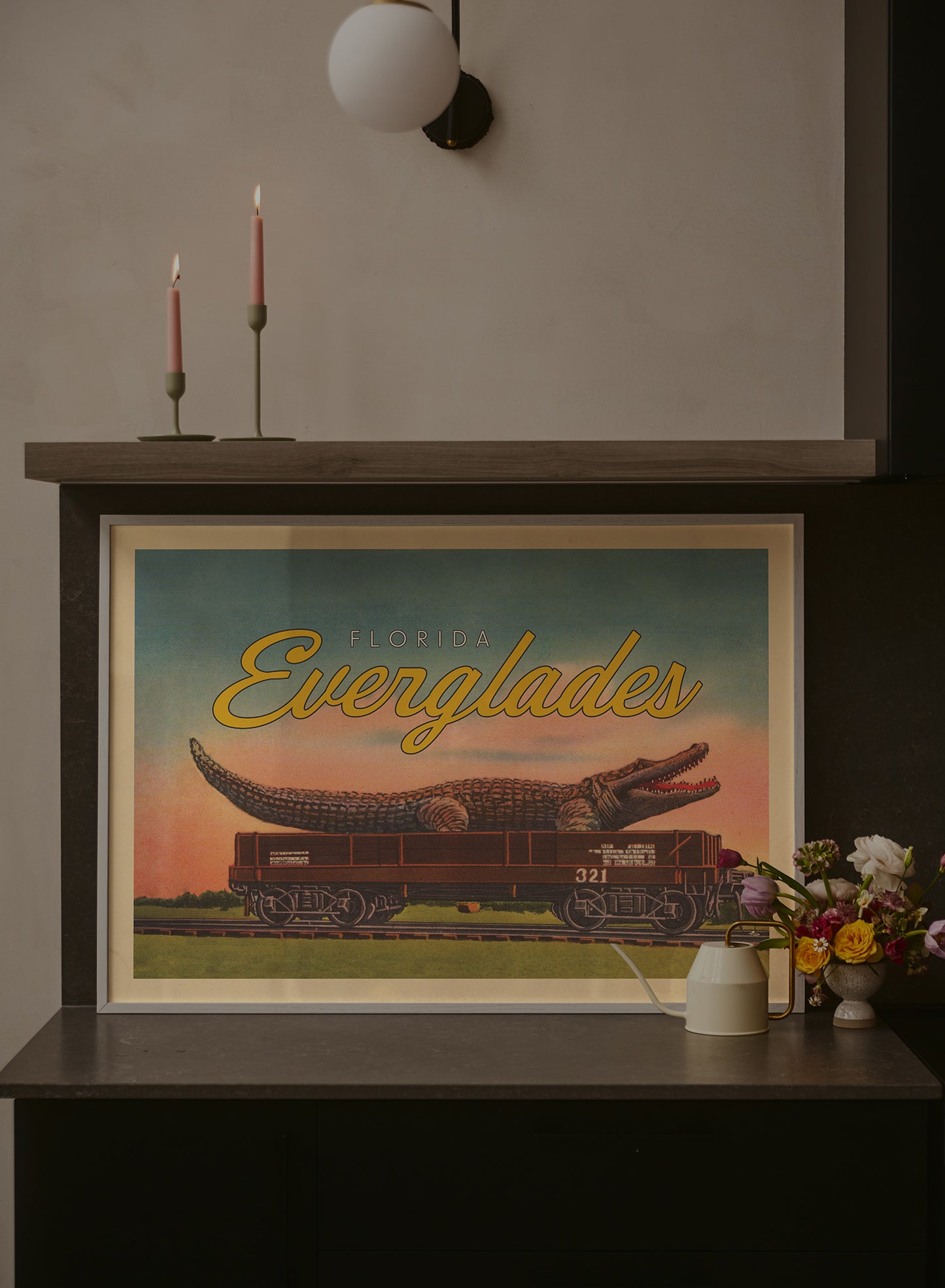 A playful twist on a Florida icon, this artwork features an oversized alligator perched on a railway car, set against a vibrant gradient of sunset hues. The bold, looping script of "Everglades" gives the piece a retro edge, perfectly complementing its whimsical concept.