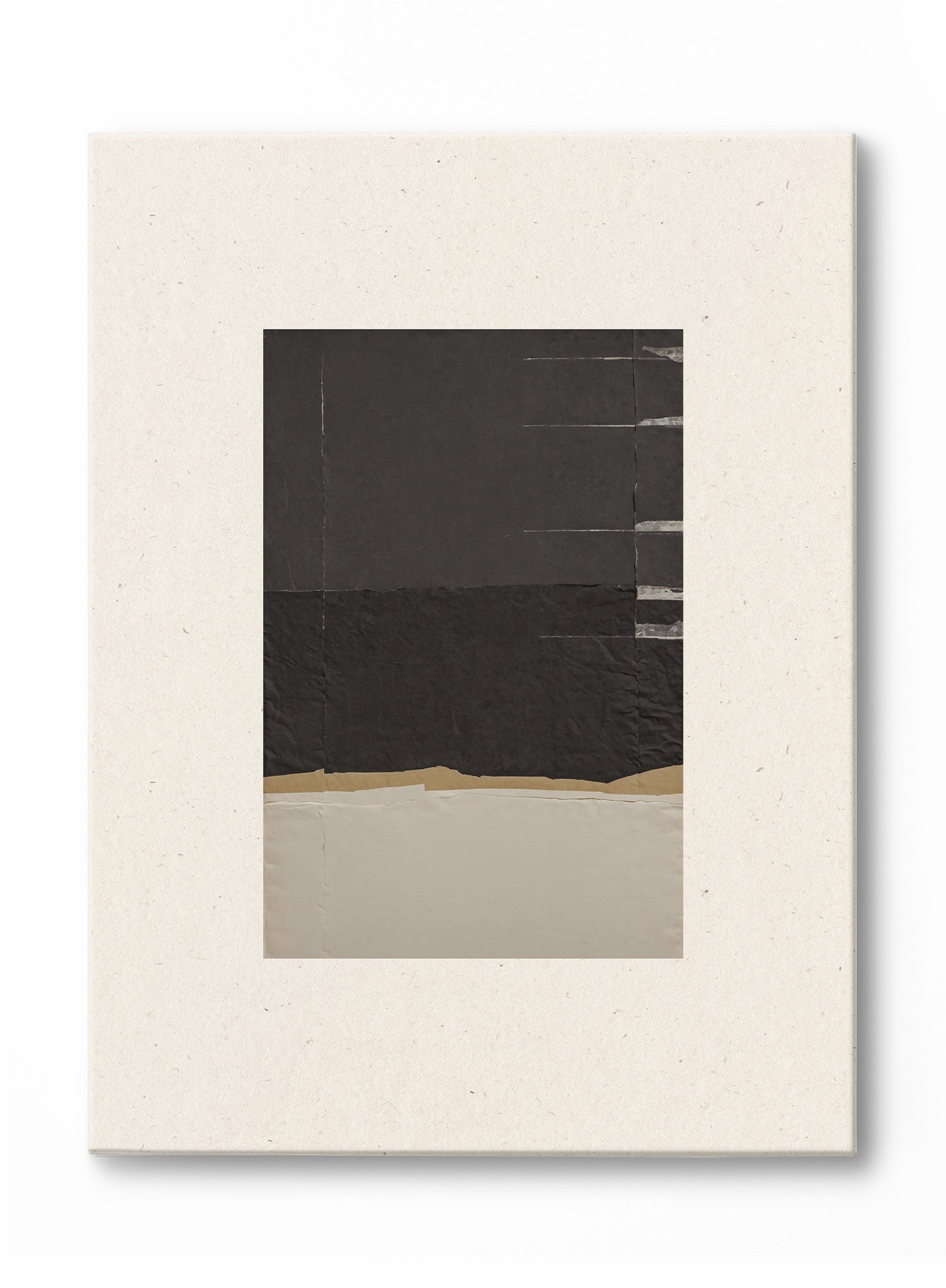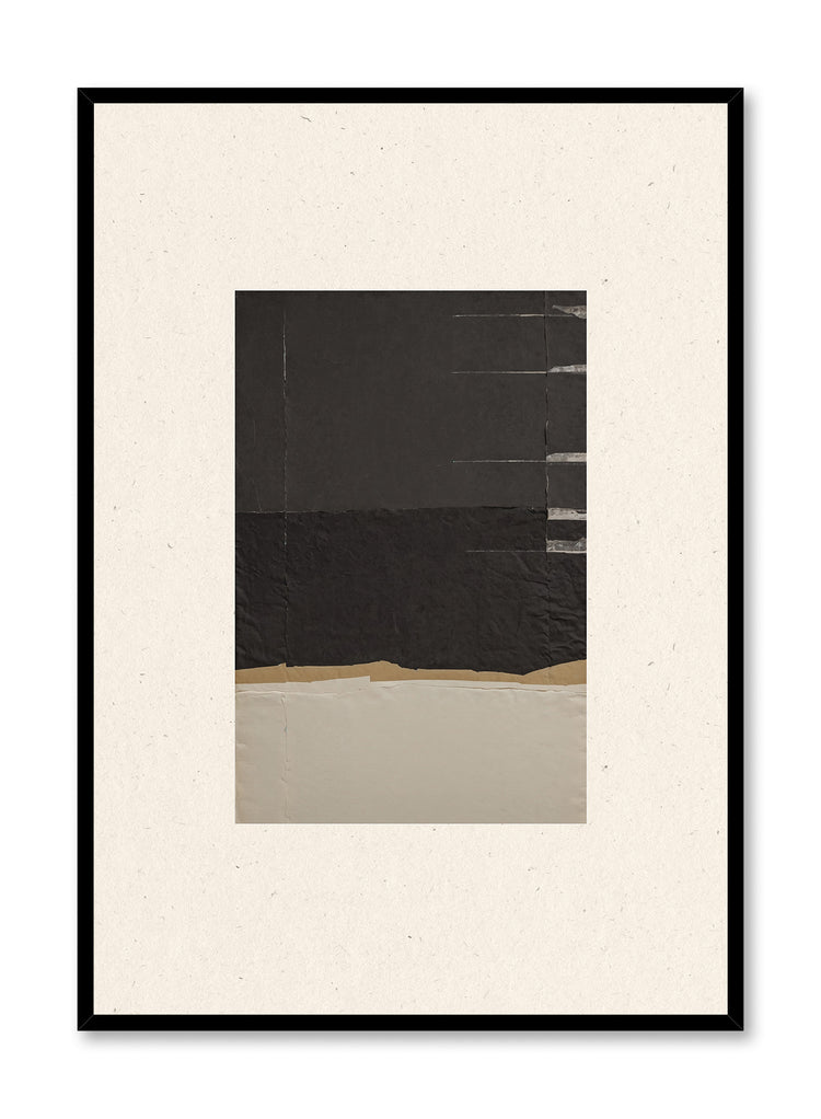 This abstract composition showcases the restrained artistry curated for Keefer House. The work features distinct horizontal bands of charcoal and warm beige, with a thin golden stripe creating subtle division between the darker and lighter sections. The piece embodies an Asian minimalism influence through its deliberate use of negative space and geometric simplicity.