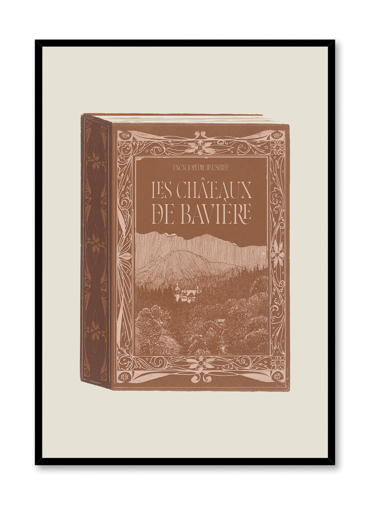 The classic book cover of “Les Châteaux de Bavière” takes center stage, rendered in rich sepia tones with ornate detailing reminiscent of timeless European craftsmanship. The illustration of Bavarian castles nestled among mountains invites a sense of wonder.