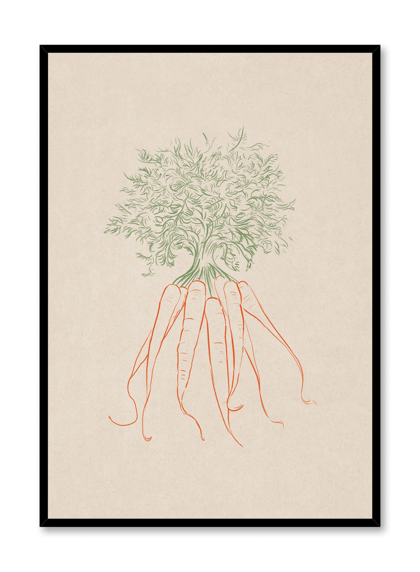 This beautifully intricate illustration reimagines a bunch of carrots as the roots of a flourishing tree, blending nature and food artistry in an unexpected way. The fine linework highlights the leafy tops as a lush canopy, while the long, twisting carrots anchor the composition with a natural elegance. The earthy green and orange hues contrast softly against the neutral background, giving it an organic, vintage feel.