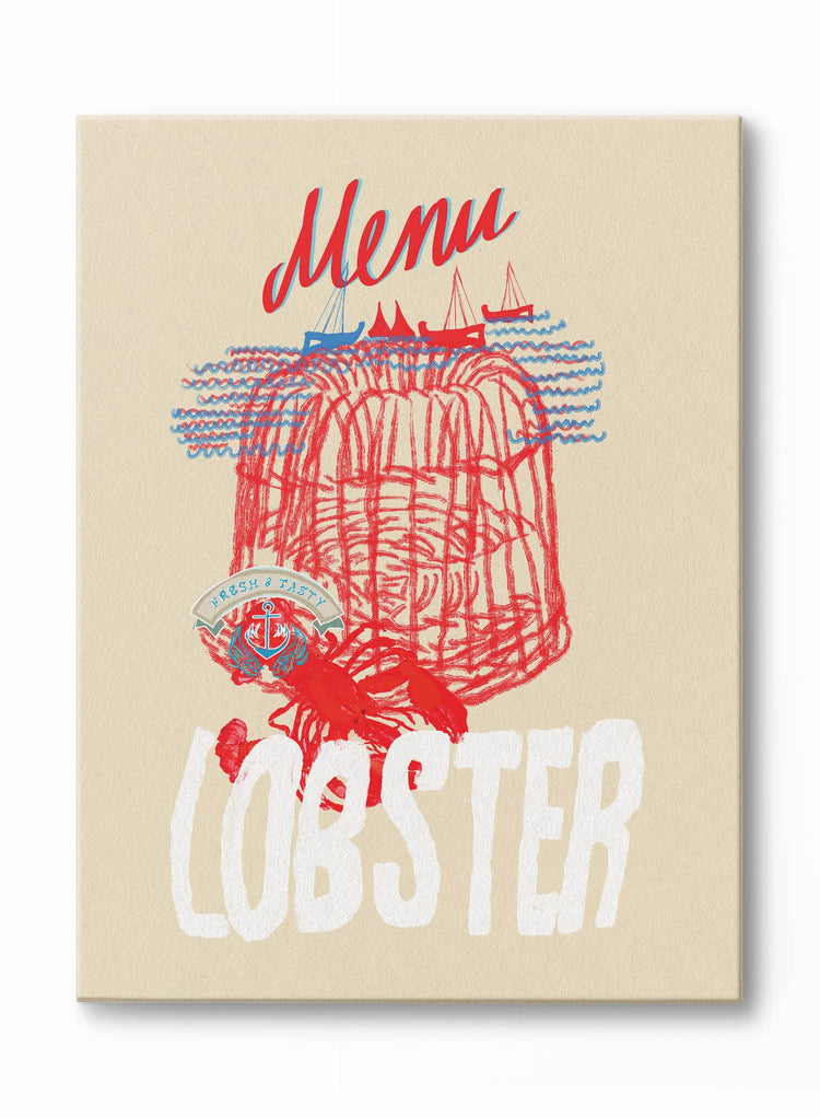 If there's freshly caught lobster on the menu, you know that's what we're having! This colorful illustrated canvas shows a red lobster in a cage with the words "menu" and "lobster" in bold lettering.