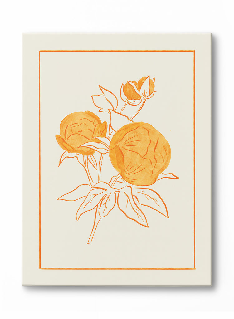 This floral canvas is composed of three yellow peony flowers with stems and leaves sketched out in orange over a white background.
