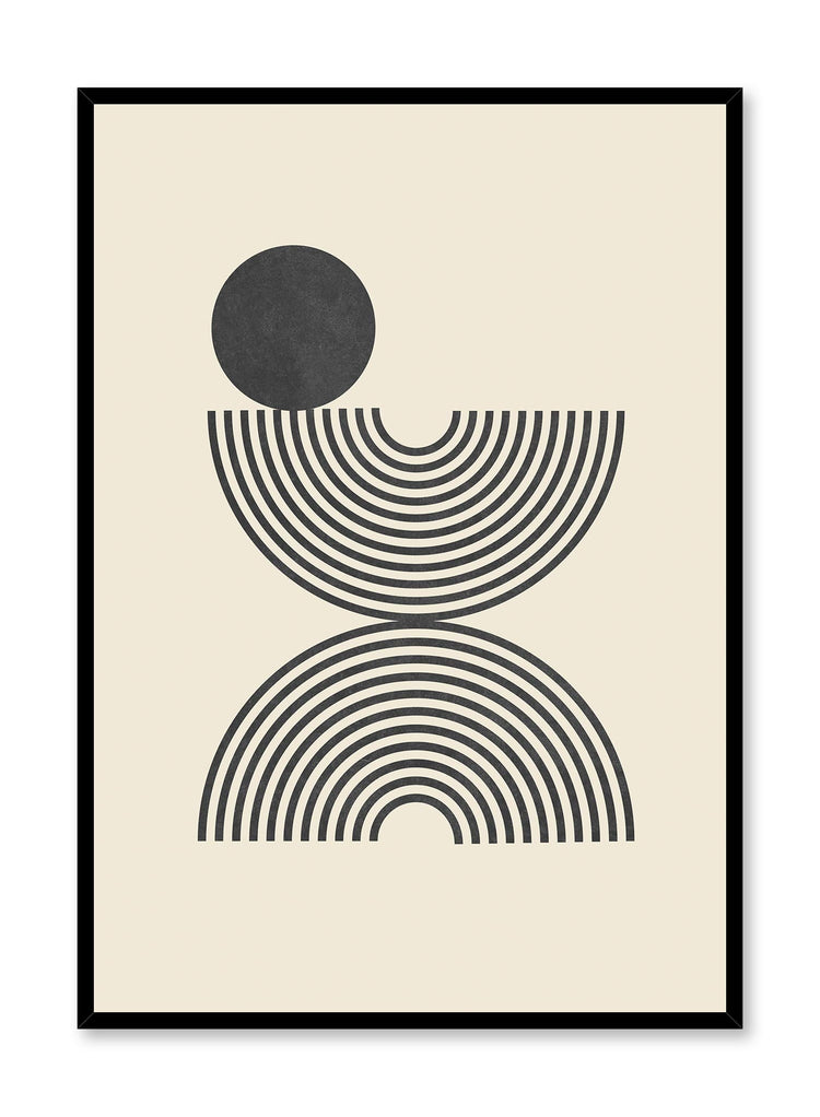 Lucia is the perfect Bauhaus art print with a hint of boho style. We’ve kept things simple with this one: two mirroring rainbow-like arches topped with a bold black circle over a soothing beige background. This poster would look stunning on its own or as part of a mid-century-themed gallery wall.
