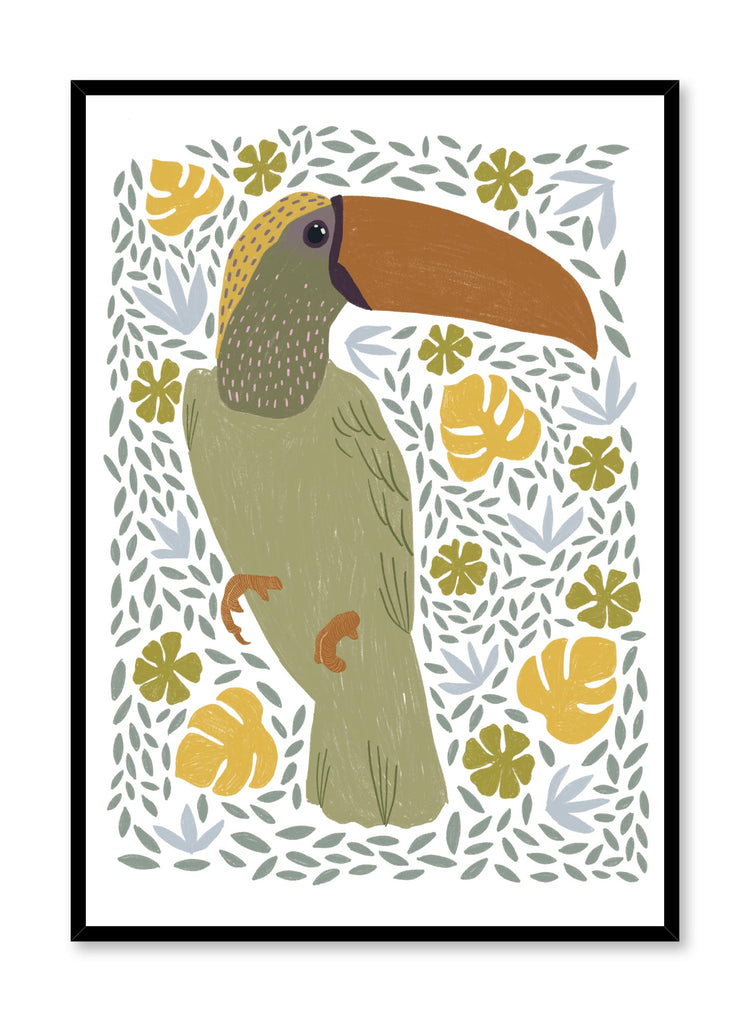 A little birdie told us this is the most popular creature in the jungle. No wonder, we can’t take our eyes off this colorful toucan! The ‘Majestic Beak’ poster features an illustration of a green toucan bird surrounded by pretty yellow and green monstera leaves and botanical designs. Add this exotic animal poster to your kids’ decor to create their very own make-believe jungle!