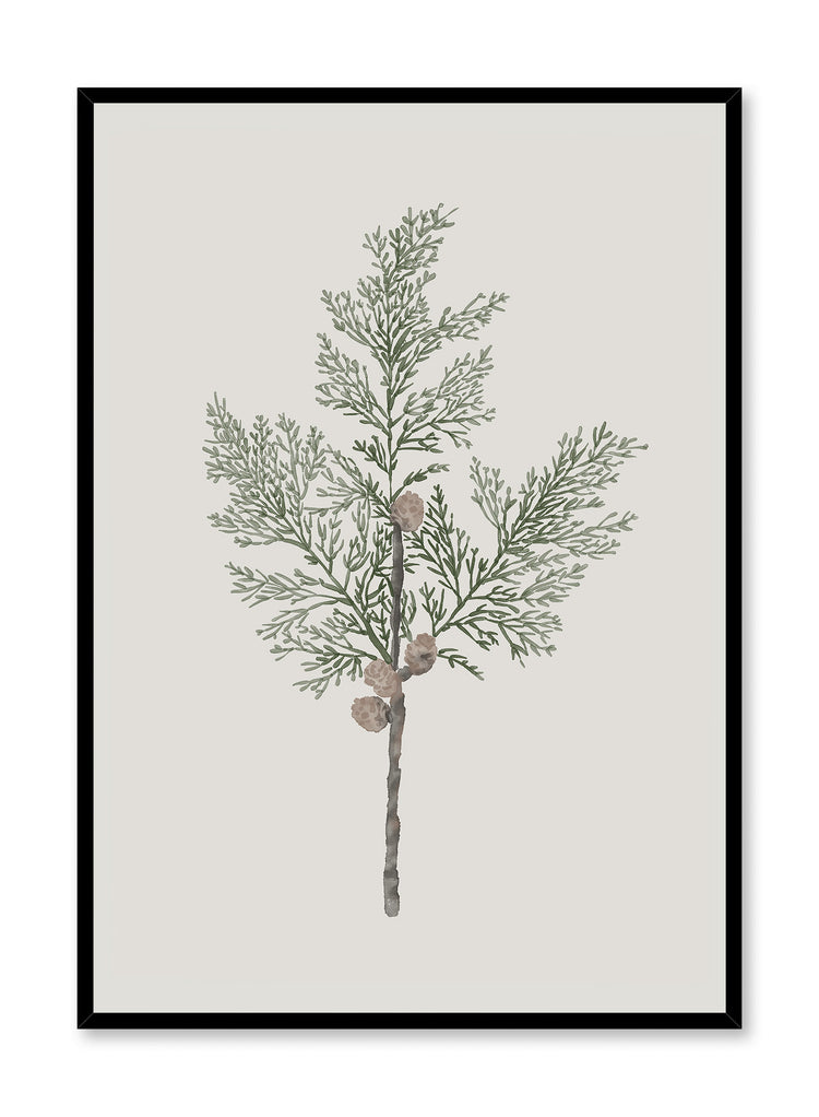 Usher in the festivities with 'Merry Bough' : a botanical illustration featuring a delicate evergreen sprig with acorns over a grey background.