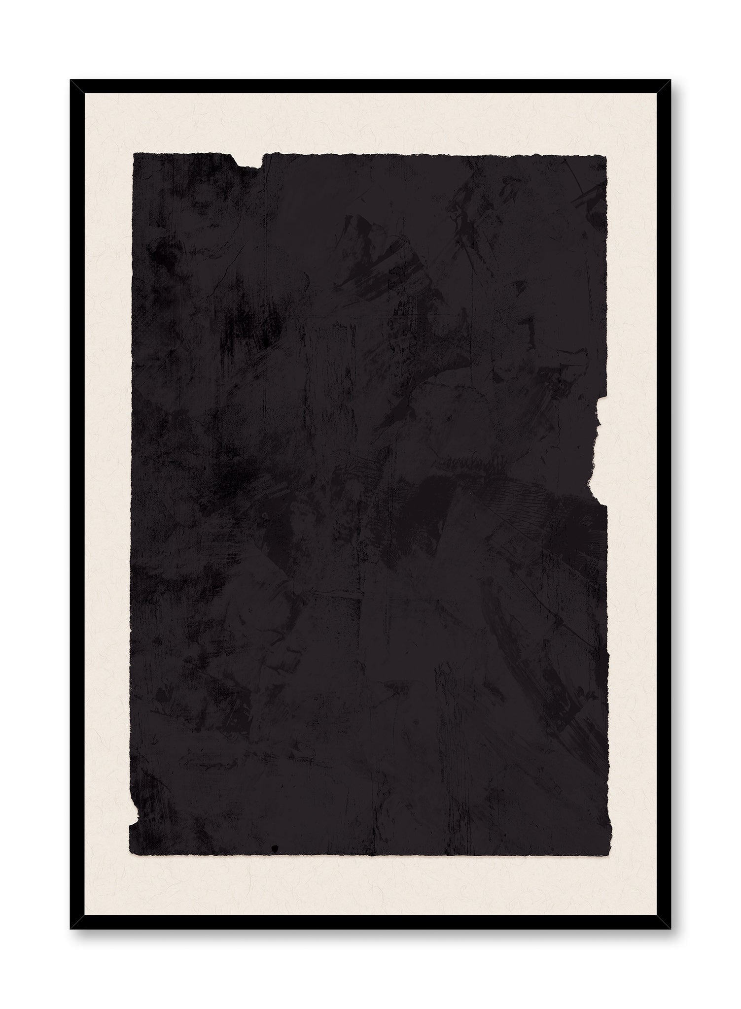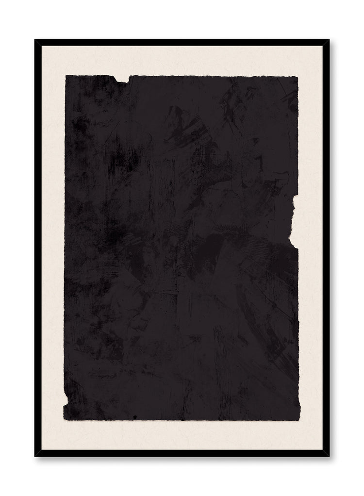 This moody abstract showcases a deep charcoal form against a soft cream background. Curated for Keefer House, the piece draws from Asian minimalism through its confident use of negative space and gestural quality. The dark mass dominates the composition with organic, weathered edges that suggest natural erosion or aged paper.