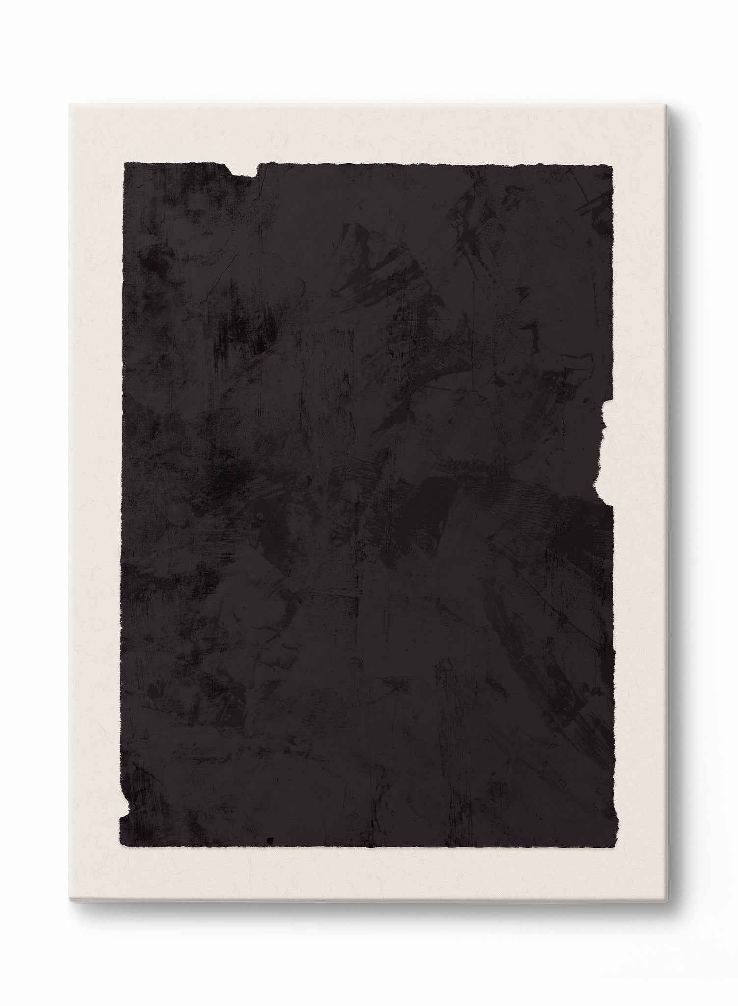 The layered washes create subtle tonal variations within the black form, while the torn, irregular perimeter adds textural interest that recalls handmade paper. The cream ground provides breathing room, allowing the dark shape to feel substantial yet unforced. This interplay between dense pigment and open space reflects a quiet, calligraphic influence.