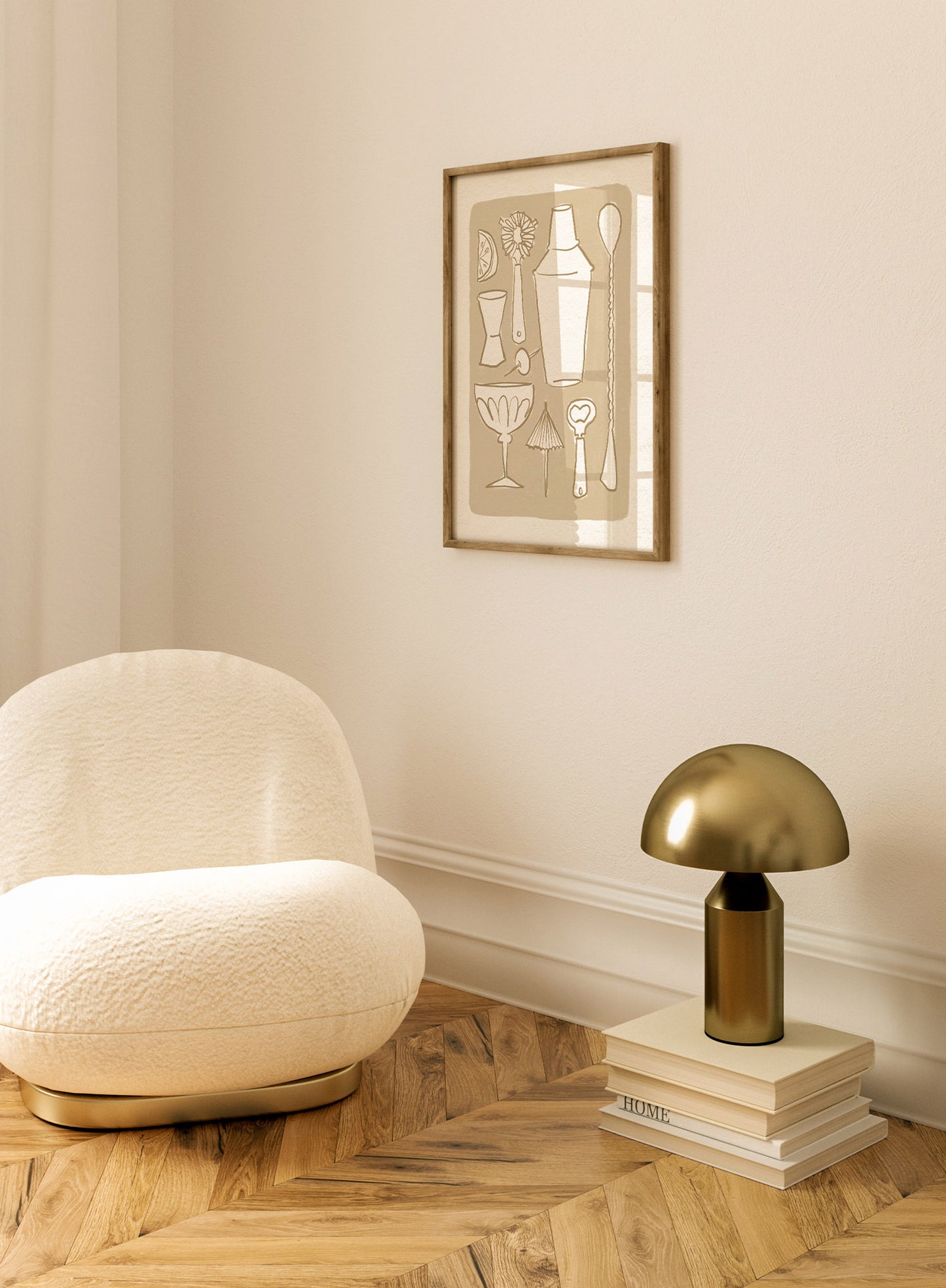 Every killer cocktail starts with these ‘Mixologist Essentials’! This art print shows bartending tools like a shaker, a shot measurer, and a pretty glass. An light brown background ties the collection together.