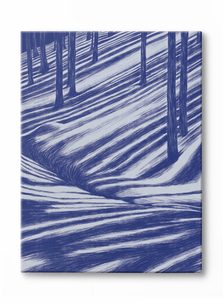 Tag along for this life-altering Moonbeam Hike! This dreamy canvas is composed of dark navy trees casting shadows on the snowy forest floor.