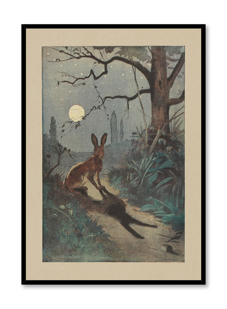 A moonlit scene unfurls in muted tones of blue and grey, featuring a hare poised mid-path, framed by the ethereal glow of a night sky. The textured brushstrokes evoke a sense of quiet magic, as if stepping into a beloved fable.