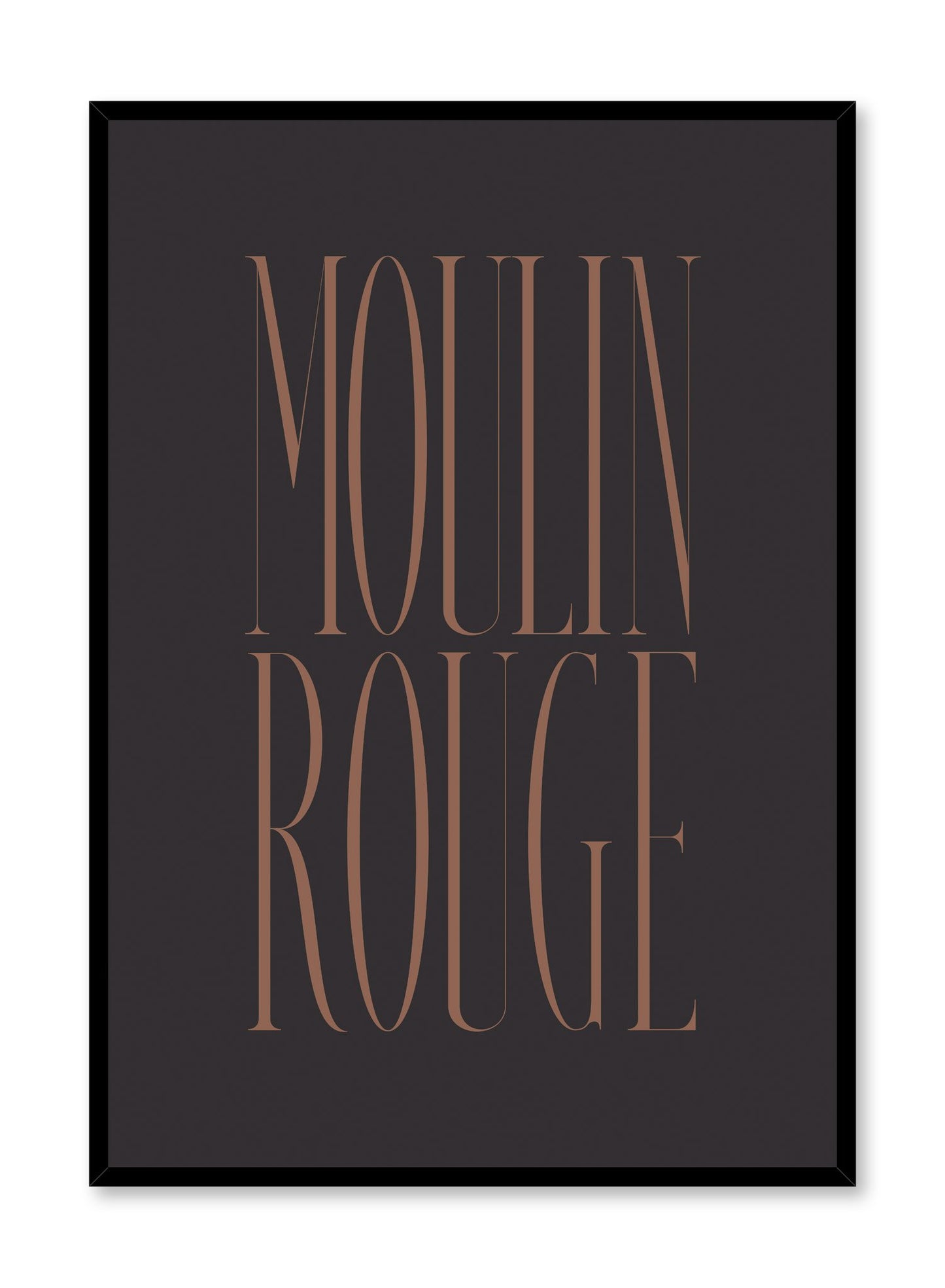 • "Moulin Rouge" is a minimalist typography poster by Opposite Wall of the word Moulin Rouge in burnt-orange vintage lettering over a black background.