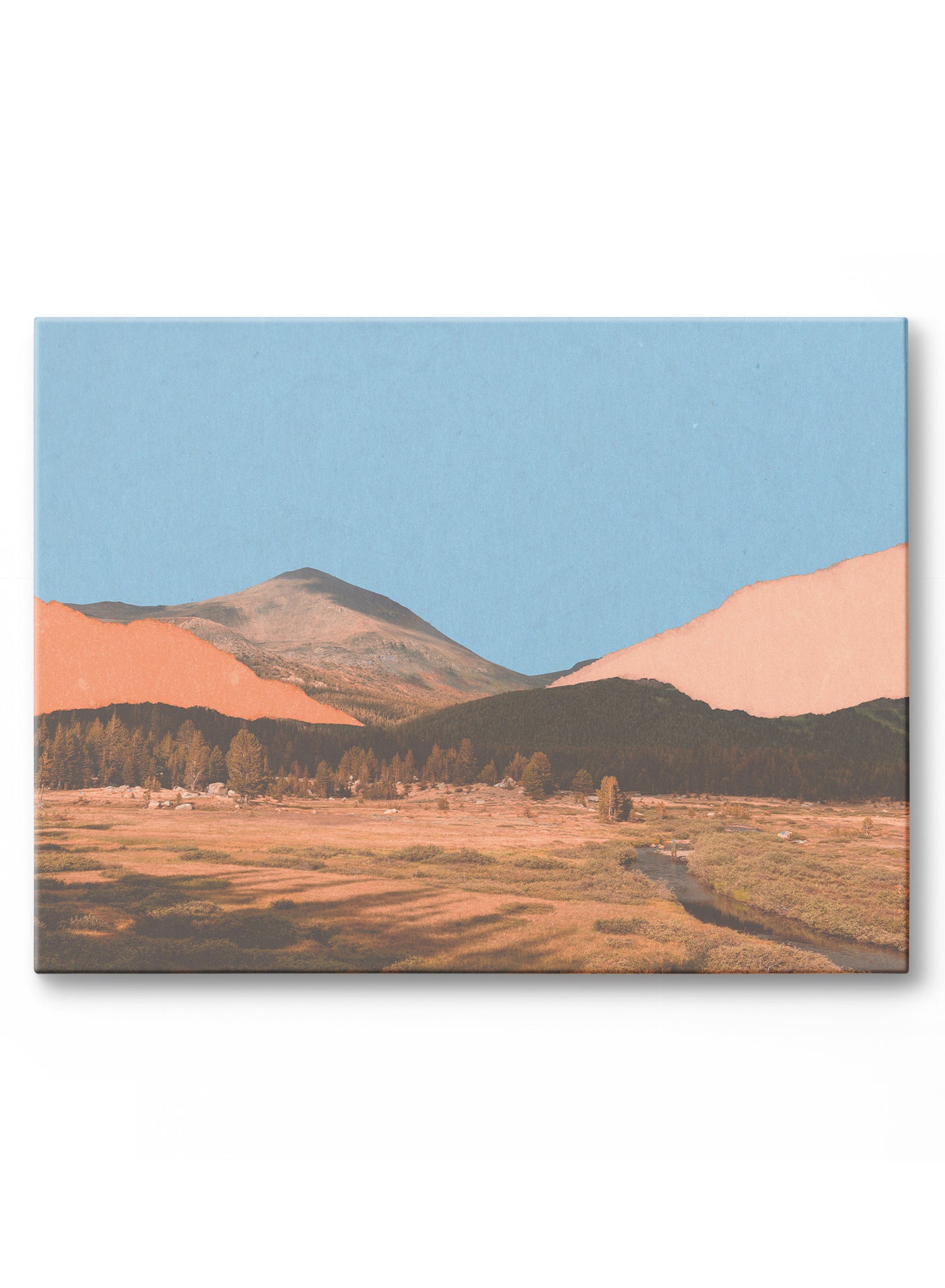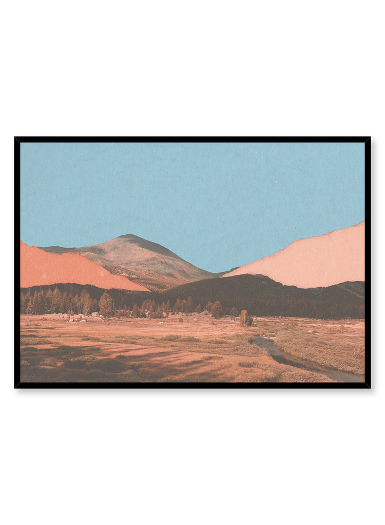 The sun is high in the sky, nature's colors are brighter than ever, and life is good! Noon in Nevada is a mountain collage with a pigmented blue sky and cut out coral hills accompanying photography of a desert valley landscape.
