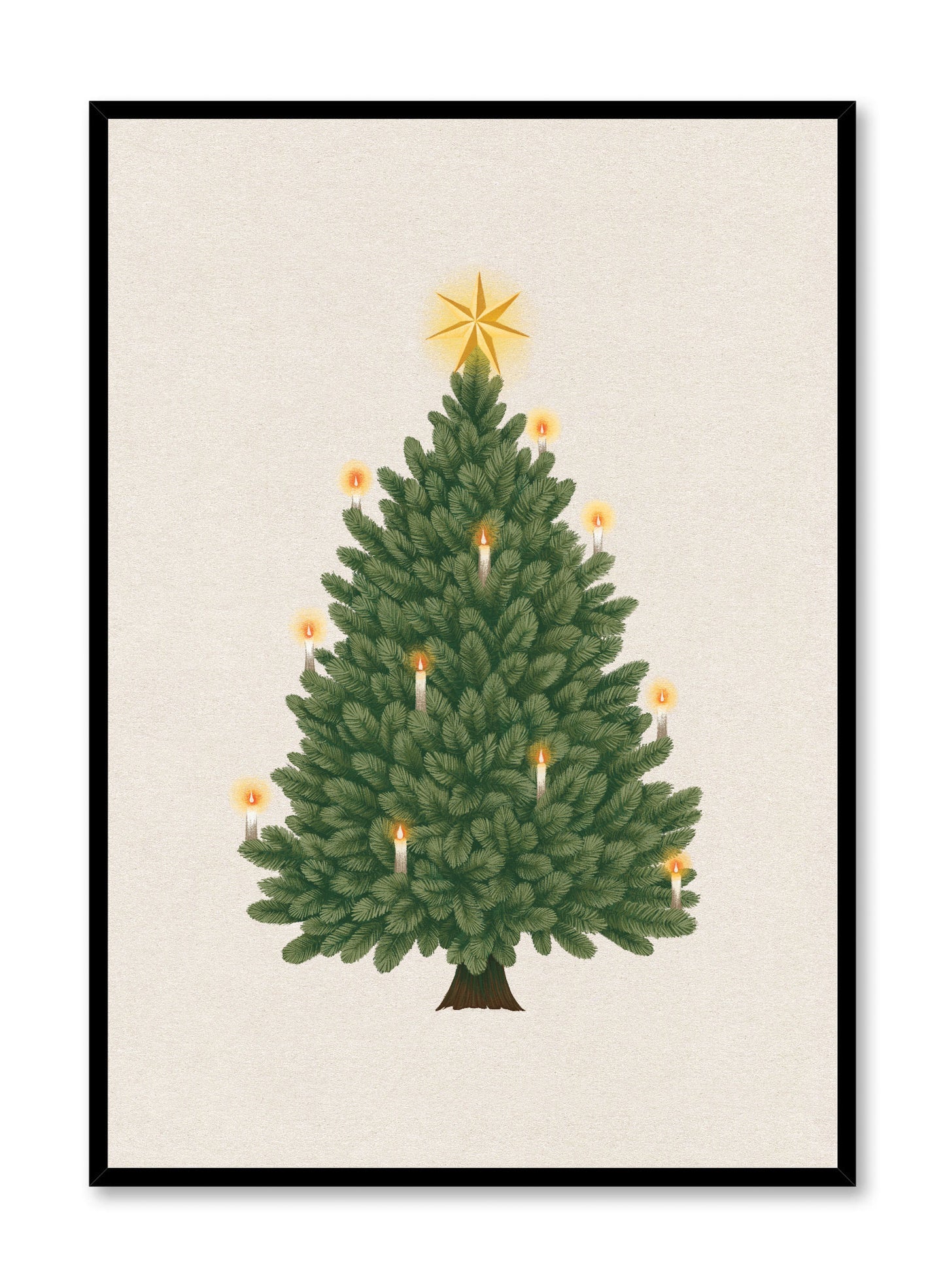 Celebrate the beauty of tradition with this classic holiday print, featuring an evergreen tree adorned with softly glowing candles and crowned with a golden star. The rich green branches contrast beautifully against the creamy backdrop, creating a scene that feels timeless and serene. The warm light from the candles casts a soft glow over the tree, evoking the cozy atmosphere of Christmases past.