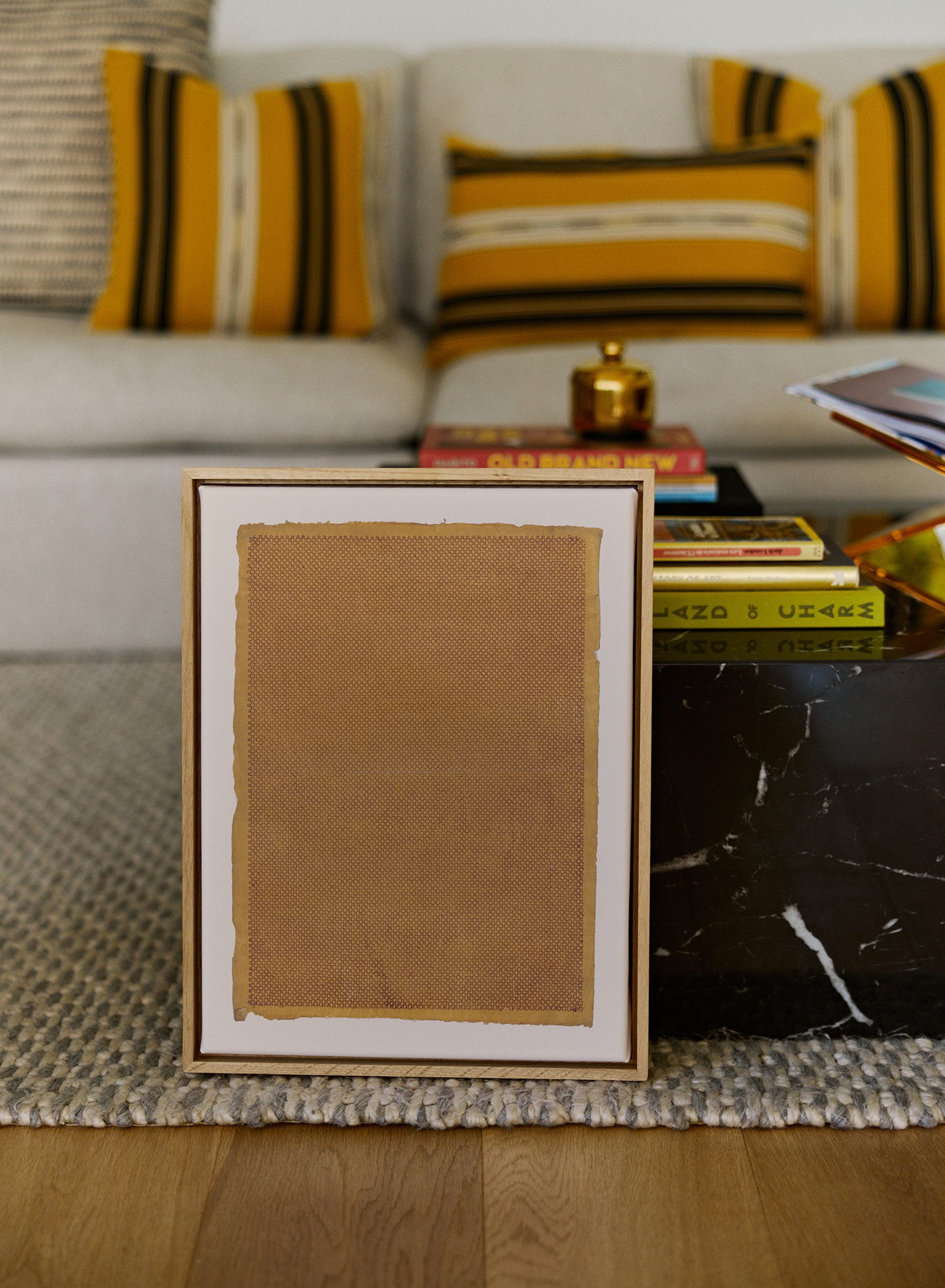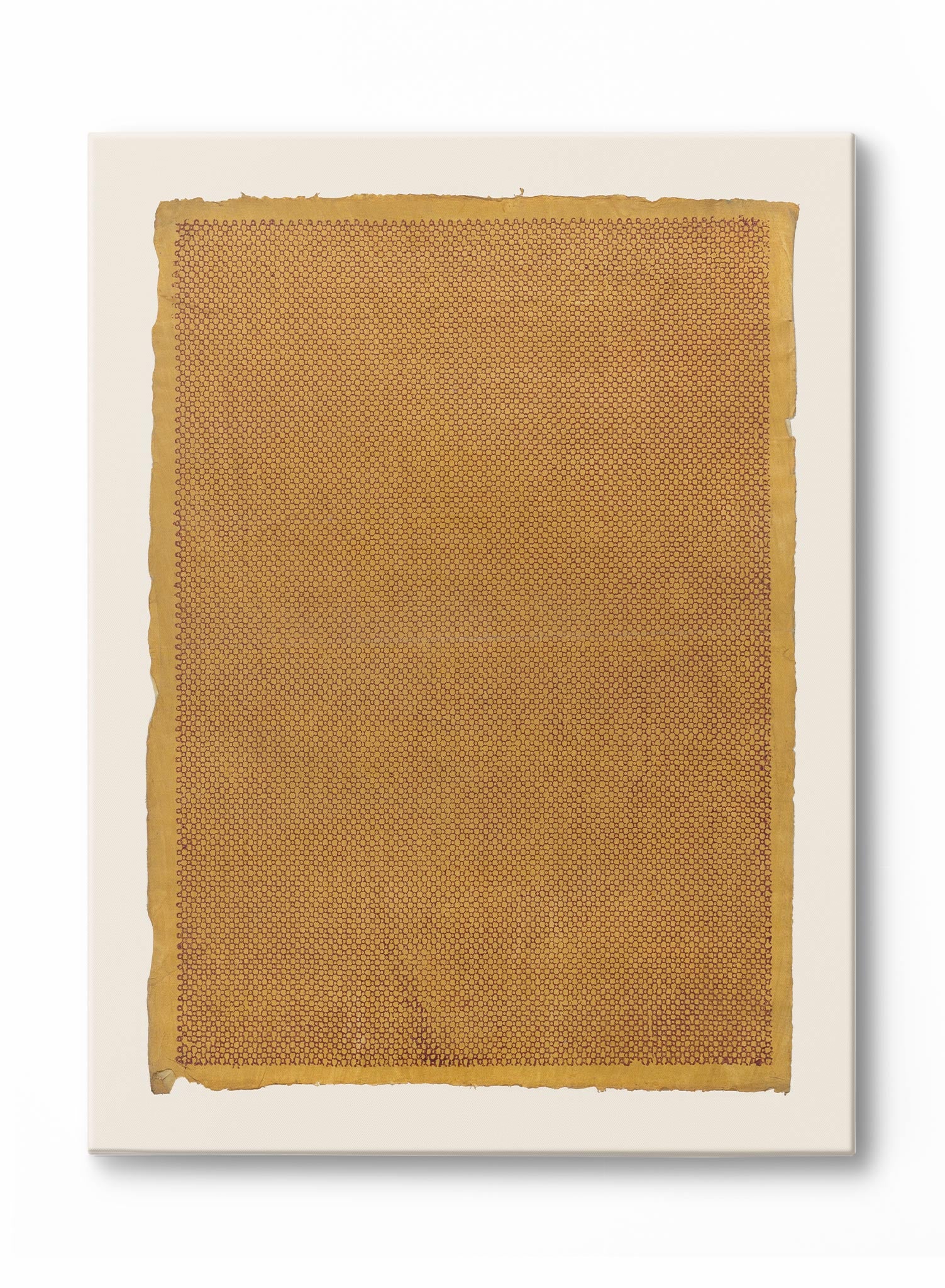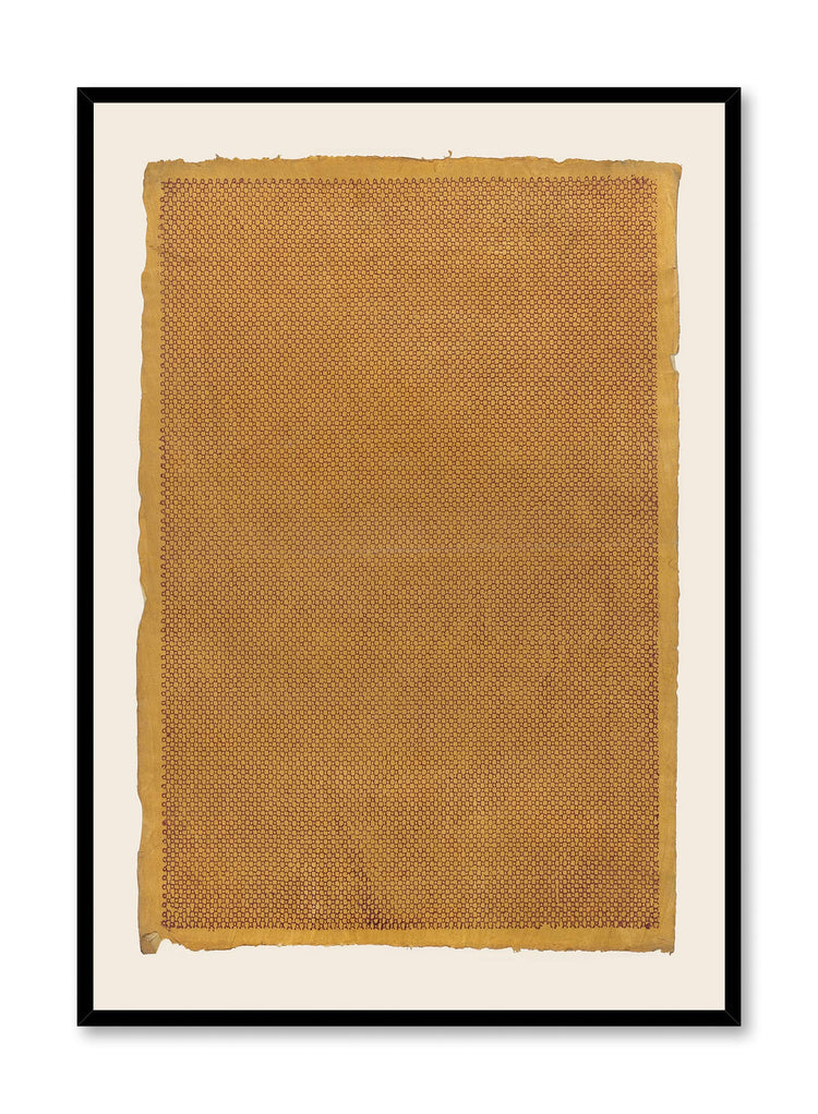 This honeyed geometric print showcases densely packed small-scale patterns across a warm amber surface. Curated for Keefer House, the work reflects a foundation in Asian minimalism through its methodical repetition and meditative structure. The composition features thousands of tiny interlocking shapes that create an almost textile-like surface, with subtle variations in density that suggest the fluid rhythm of traditional calligraphic brushstrokes.