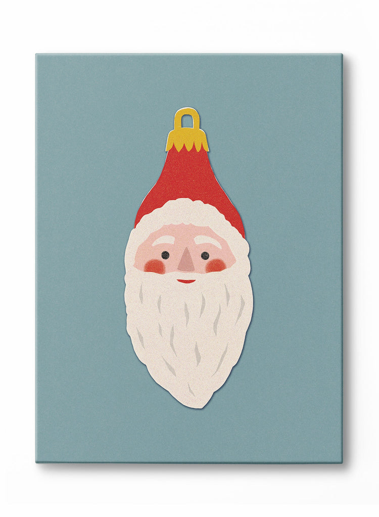 This canvas features a charming Santa Claus ornament, his rosy cheeks and twinkling eyes set against a soft blue background. The simplicity of the design captures the joyful spirit of the holiday season, with Santa's iconic red hat and fluffy white beard adding a touch of festive cheer.