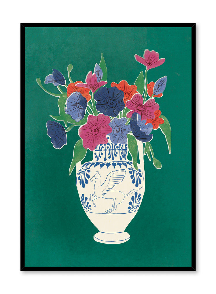 Bring color and texture to your wall with this still life painting of a multicolored flower bouquet in a white and blue vase over a green background.