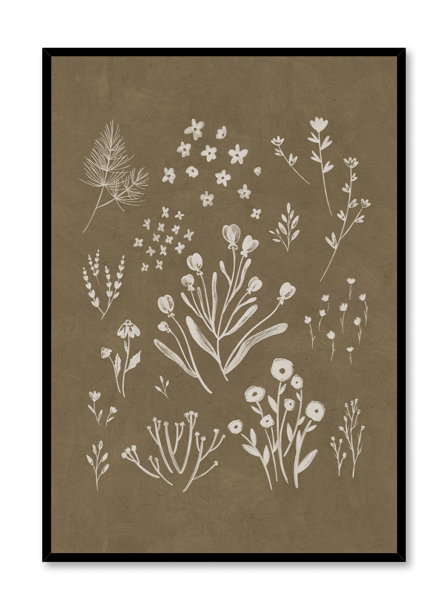 Delicate botanical illustrations cascade across a soft olive-brown background in this nature-inspired print. The intricate white floral motifs create a harmonious balance of texture and simplicity.