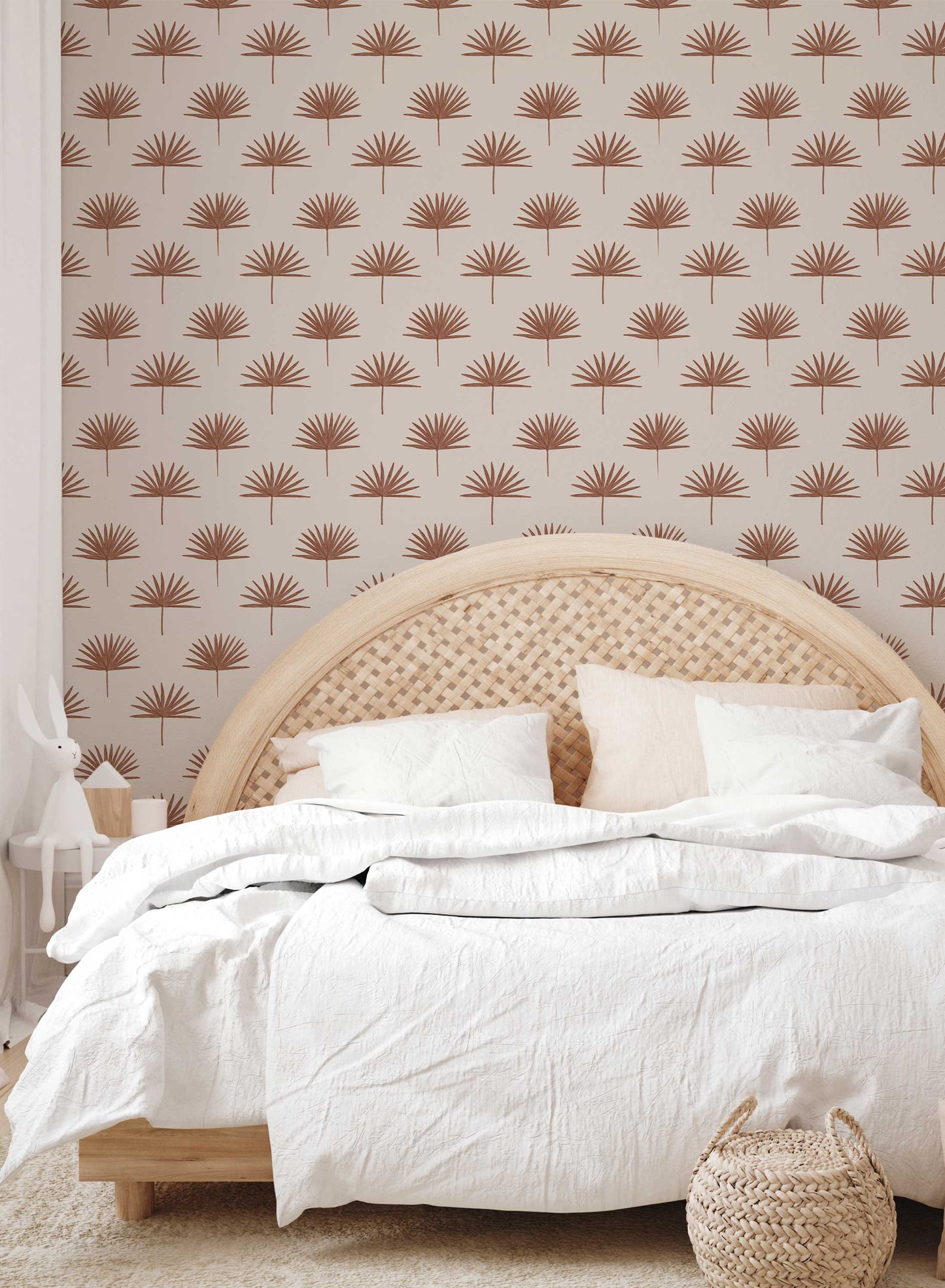 Give your space a tropical twist with the ‘Palm Lane’ wallpaper. This stunning boho wallpaper pattern features minimalist tan palm trees over a subtle watercolor background. This tropical bohemian wallpaper is available in removable peel & stick and pre-pasted formats and is easy to install.