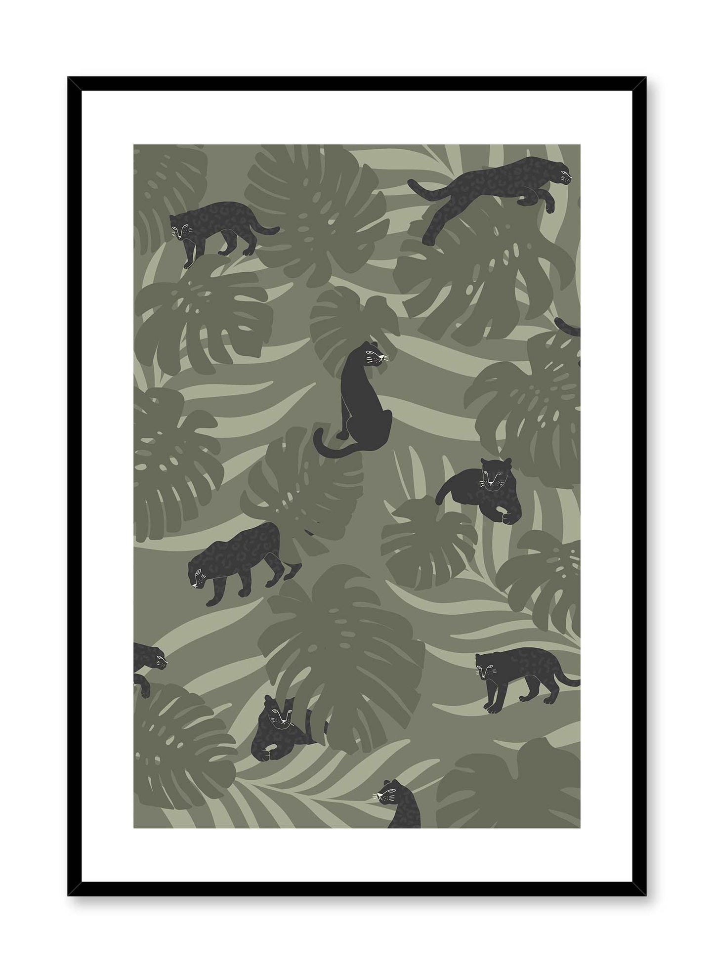• Panther Clan is a minimalist illustration of many black panthers resting or running on a green monstera and leaves background by Opposite Wall.