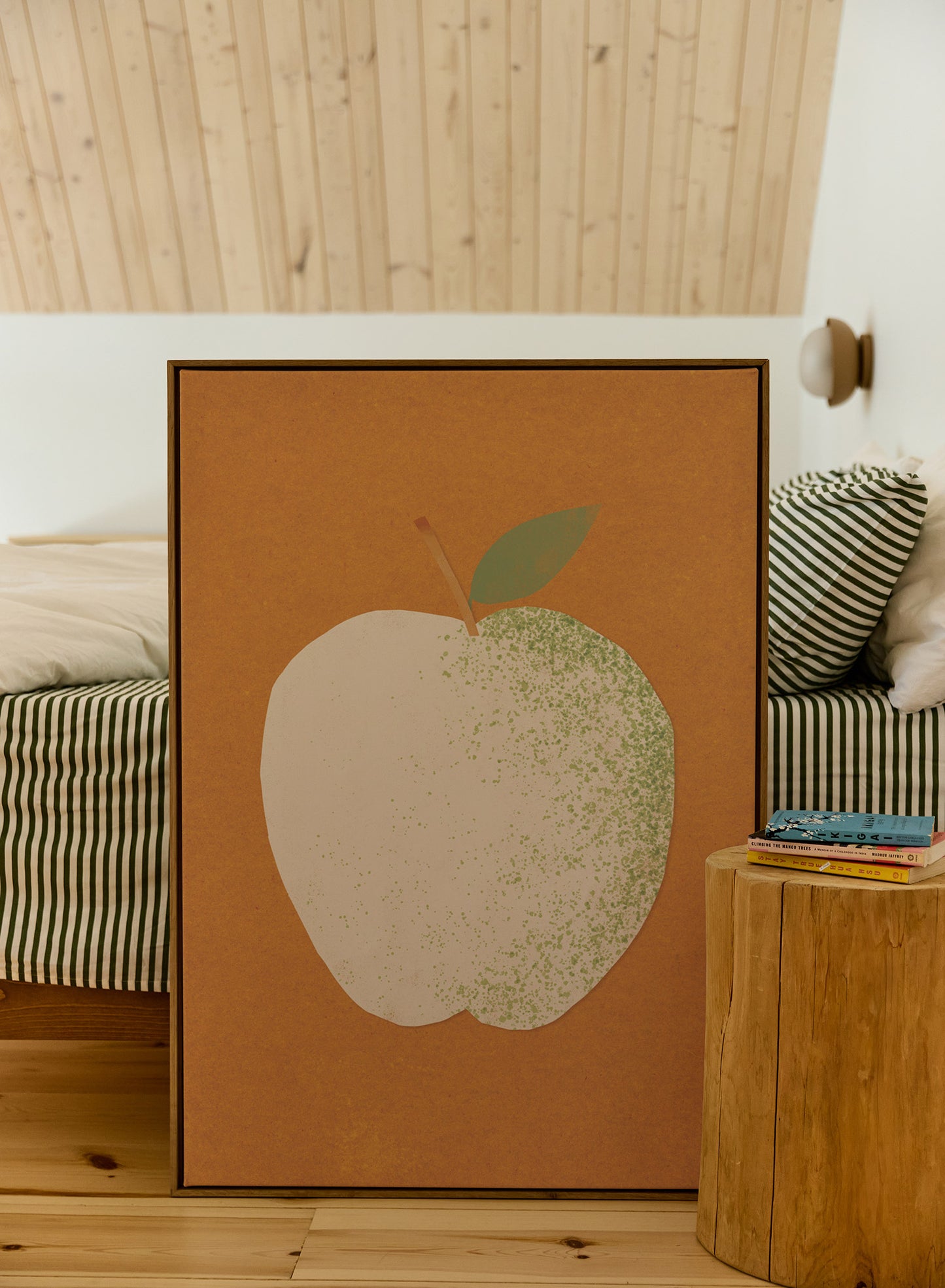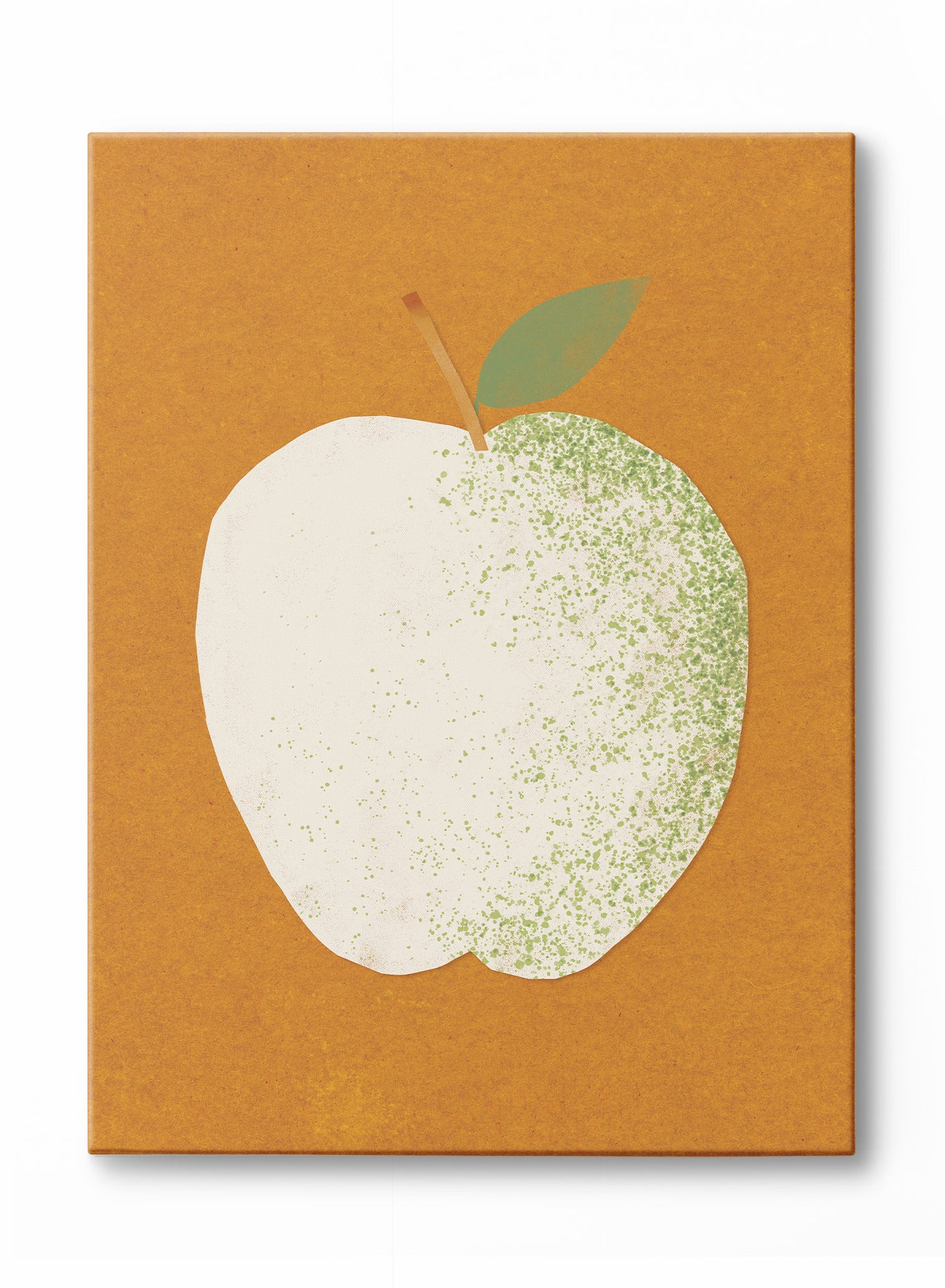 A crisp, cream-colored apple with a dusting of fresh green speckles stands against a warm, ochre background in this print. The simple silhouette is balanced by soft texture and painterly strokes, giving it a handcrafted, vintage feel. The muted green leaf and stem add just the right amount of contrast.