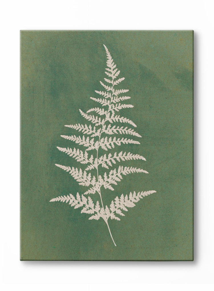 A single ivory fern frond stands tall against a deep green backdrop, its delicate leaves rendered with intricate detail. The simple composition highlights the elegance of the natural form, offering a sense of calm and refinement.