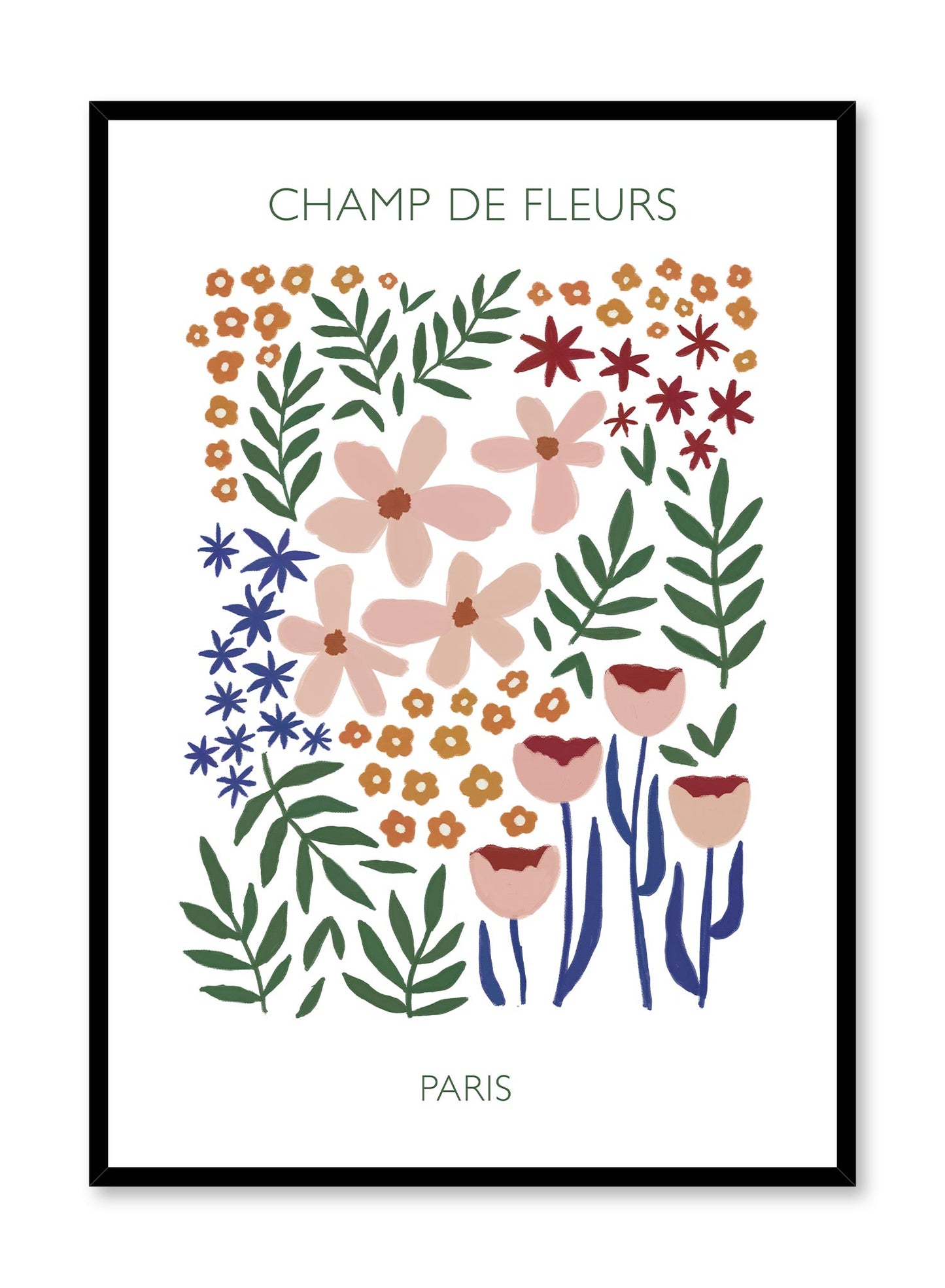 Parisian aesthetic with a floral twist? It’s a ‘oui’ for us! Deck your walls with this multicolored floral art print featuring pink tulips, orange flowers and other pretty blue and green botanical elements over a white background. This poster includes a typography of the words ‘champ de fleur’ which means ‘field of flowers’ in French.