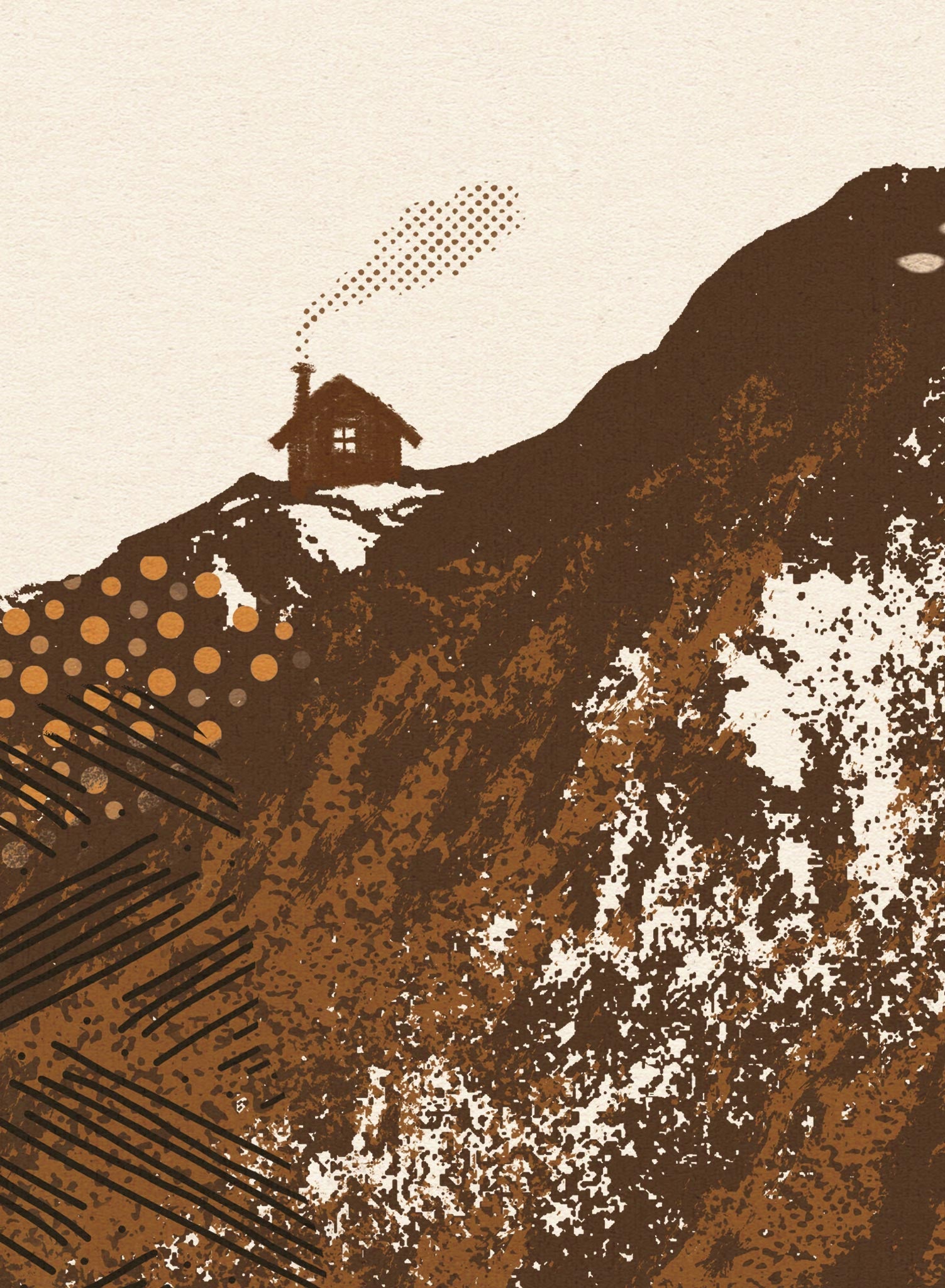 Rich earthy tones dominate the palette, with warm browns and creams creating a harmonious balance. The intricate detailing of the trees and cabin contrasts with the smooth expanse of the sky, enhancing the visual interest. The use of texture in the mountains and foliage adds a tactile quality, inviting closer inspection.