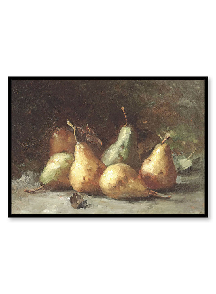 Discover Hubert Bellis' 'Pears' with this exquisite still-life painting poster of green and yellow pears laying on a table. Elevate your space with this must-have addition for art lovers.