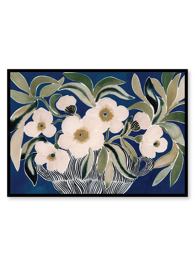 Now, that's a show-stopper! This horizontal floral painting stars light pink and yellow flowers and greenery over a deep blue background.