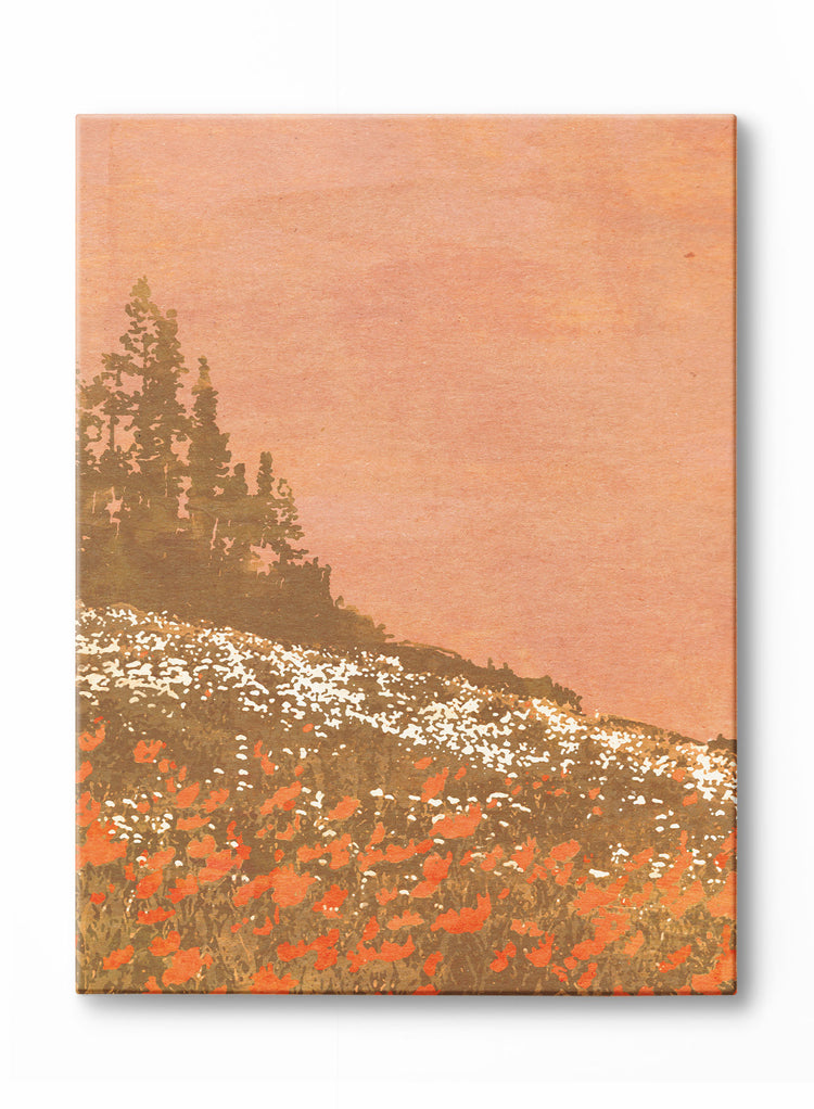 This landscape is what dreams are made of! Poppy Hill is a boho landscape featuring a field of red and white flowers under a pink sunset sky.