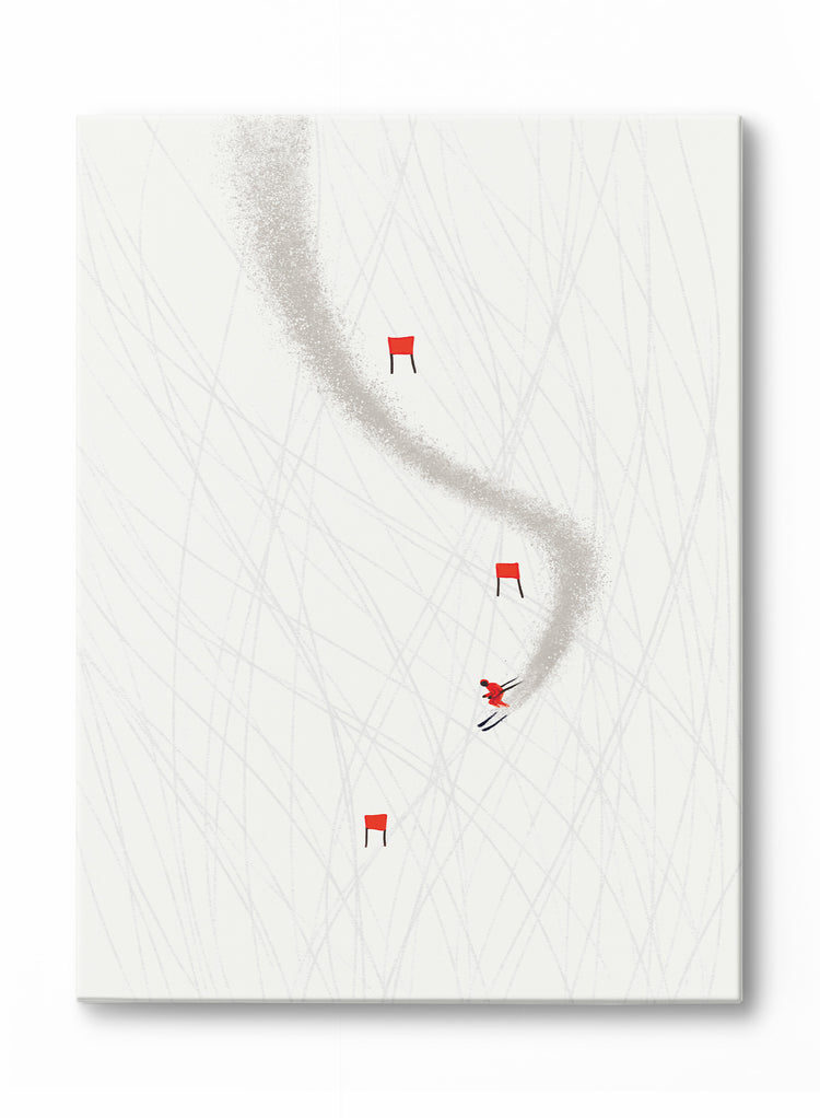 All skiers know it: a 'Powder Day' is a great day on the slopes! This minimalist winter canvas features a skier dressed in red zig zagging around flags on a snowy hill.