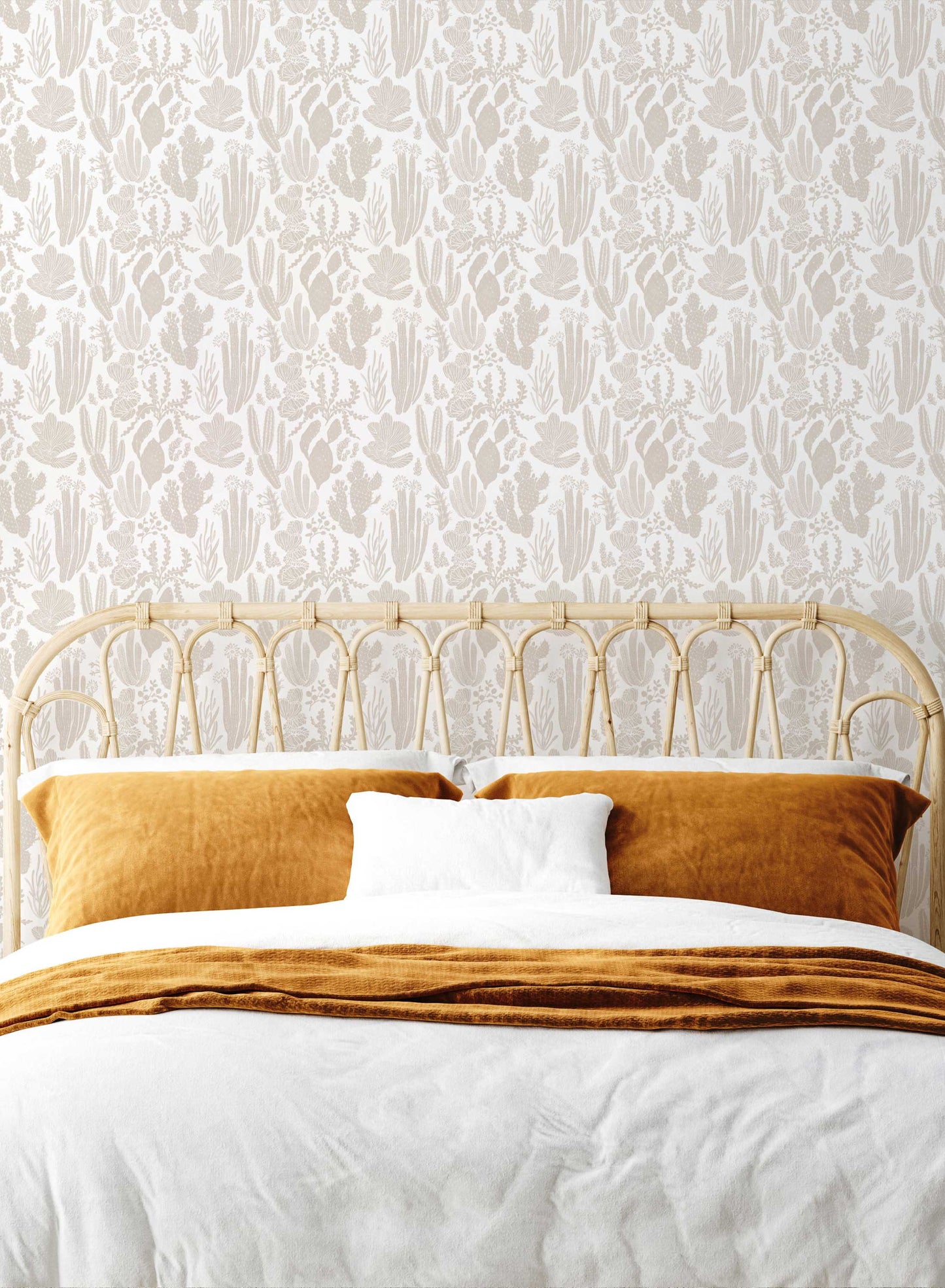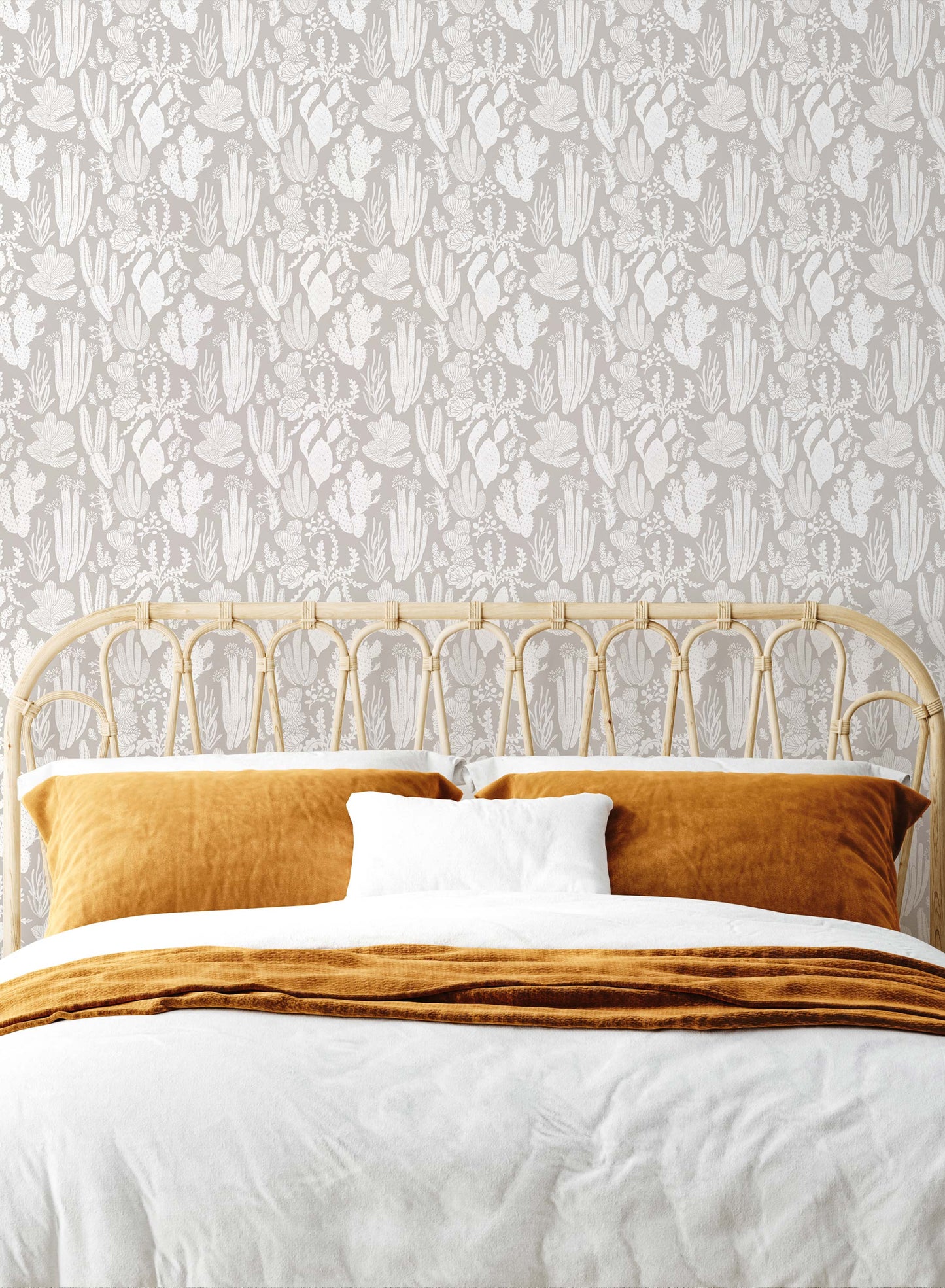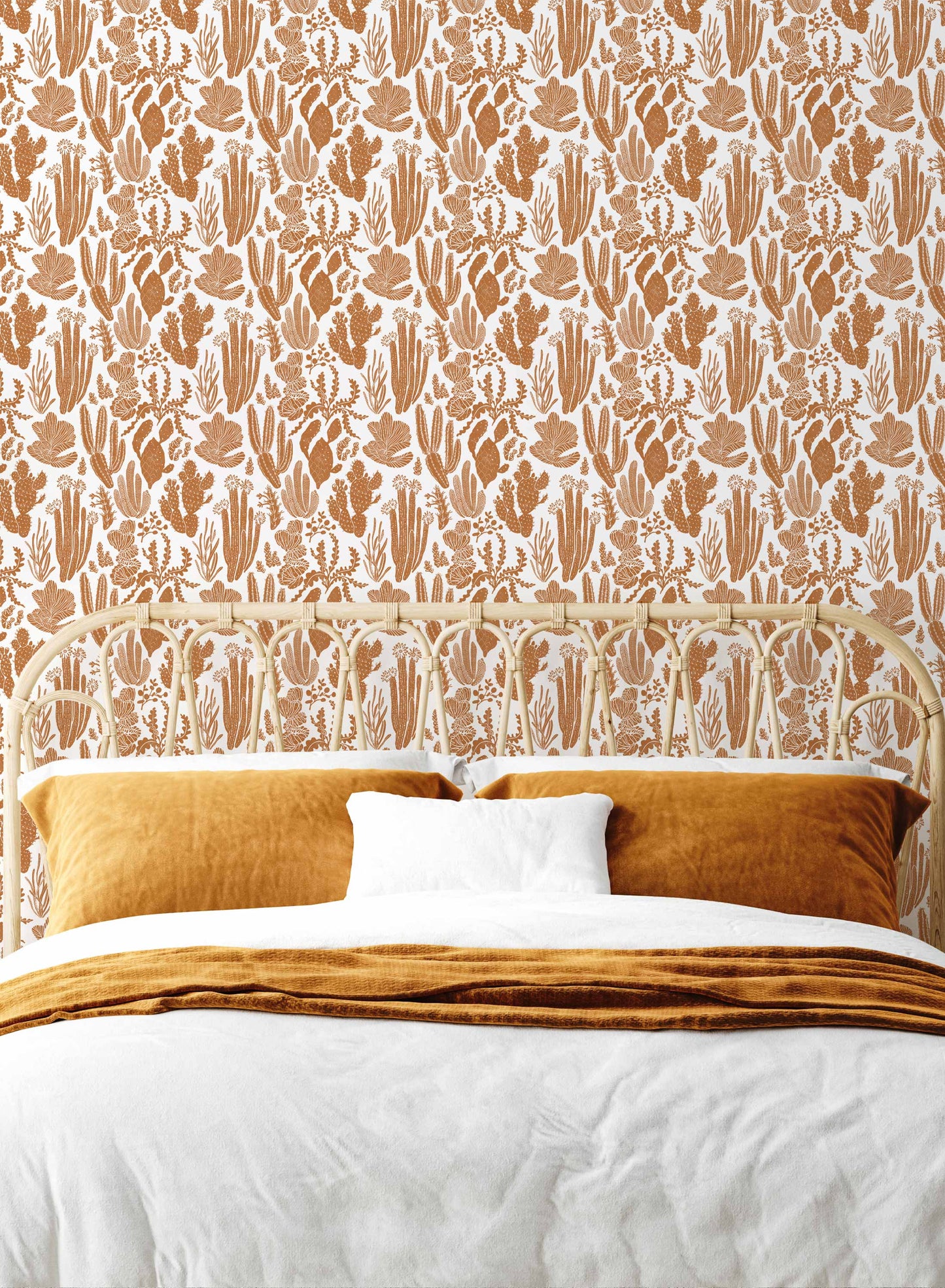You can’t live in a cactus nursery, but this tropical wallpaper is the next best thing! ‘Prickly Situation’ is a stunning botanical wallpaper featuring a wide array of cacti and succulents. This affordable bohemian wallpaper design includes a flowering cactus and many other leaves and plants. Find this wall covering in removable peel & stick and pre-pasted formats online at Opposite Wall.