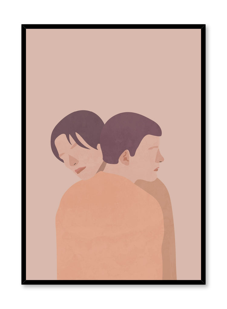 • "Proximity in Beige" is a minimalist and romantic illustration poster by Opposite Wall of couple hugging lovingly in shades of beige, brown and orange.