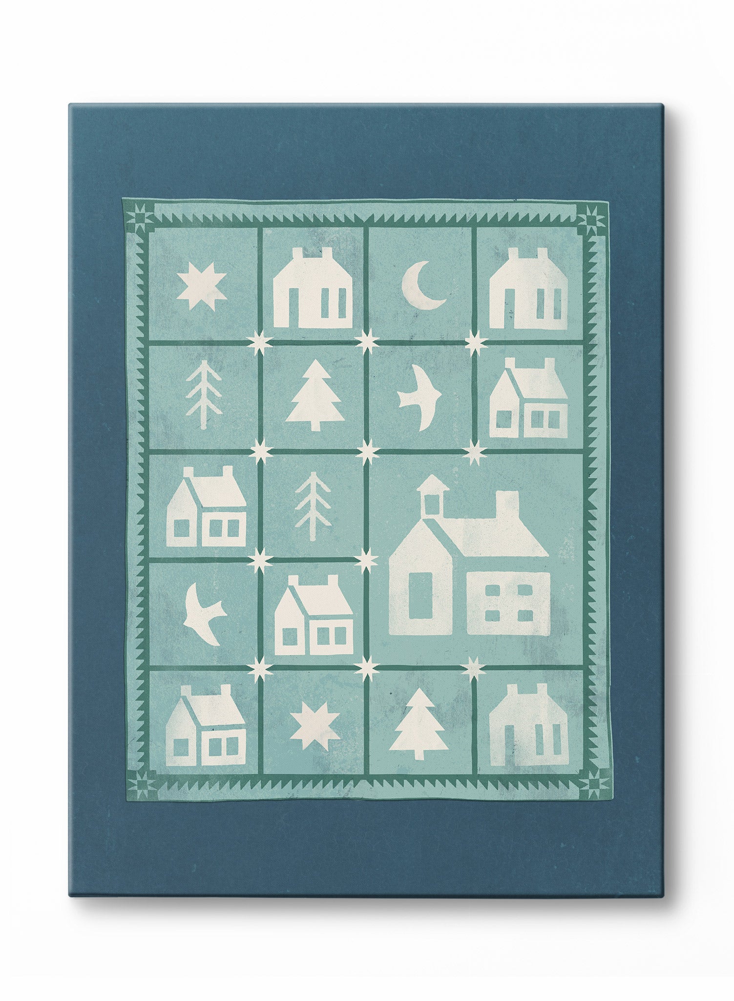 This print presents a charming quilt-like pattern featuring quaint houses, delicate stars, and graceful trees, all set against a soothing teal backdrop. The arrangement of these elements creates a harmonious grid, evoking a sense of cozy winter nights and serene landscapes. The subtle contrast between the soft white motifs and the rich background adds depth and interest to the piece.