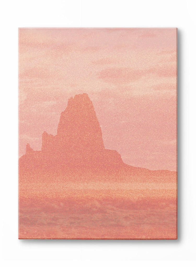 When the setting sun fills the sky with color particles, scientists call it a Rayleigh Scattering. We simply call it beautiful! In this canvas, a mountain and desert landscape are tinted red.