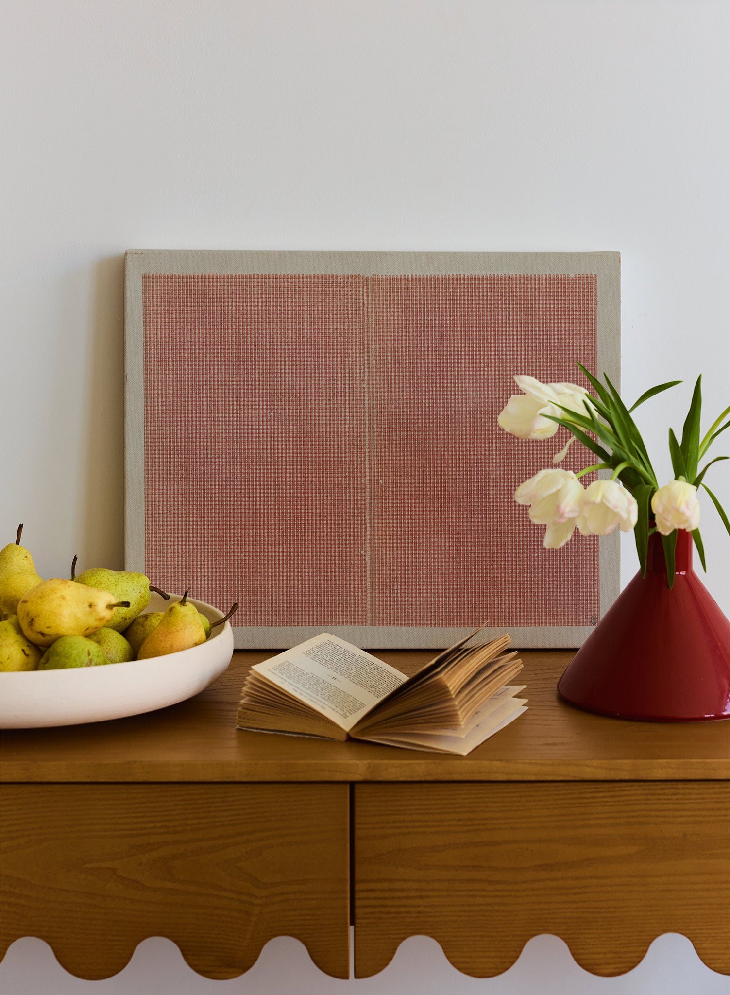Perfect for spaces that value quiet sophistication, this piece works well in dining rooms where its warm tones complement natural wood, or in bedrooms where its repetitive pattern creates calm focus. Pair it with linen textures, ceramic vessels, or woven baskets to enhance its textile-inspired aesthetic. The neutral palette makes it an ideal anchor for minimalist interiors seeking warmth without distraction.